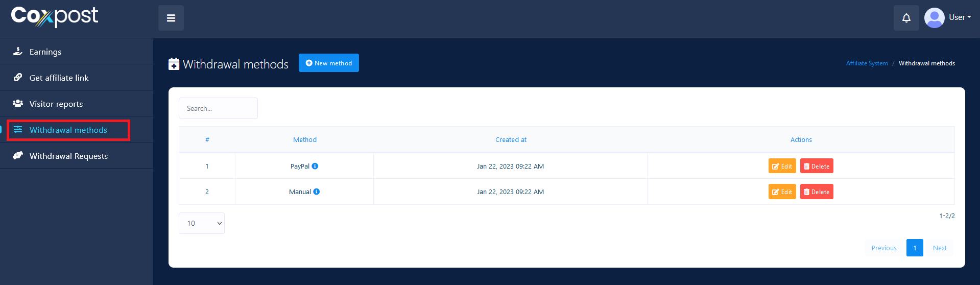 Withdrawal Methods refers to how or with which way Affiliate can request money from his earning to the owner of the product. Go to Withdrawal Methods and add your methods.