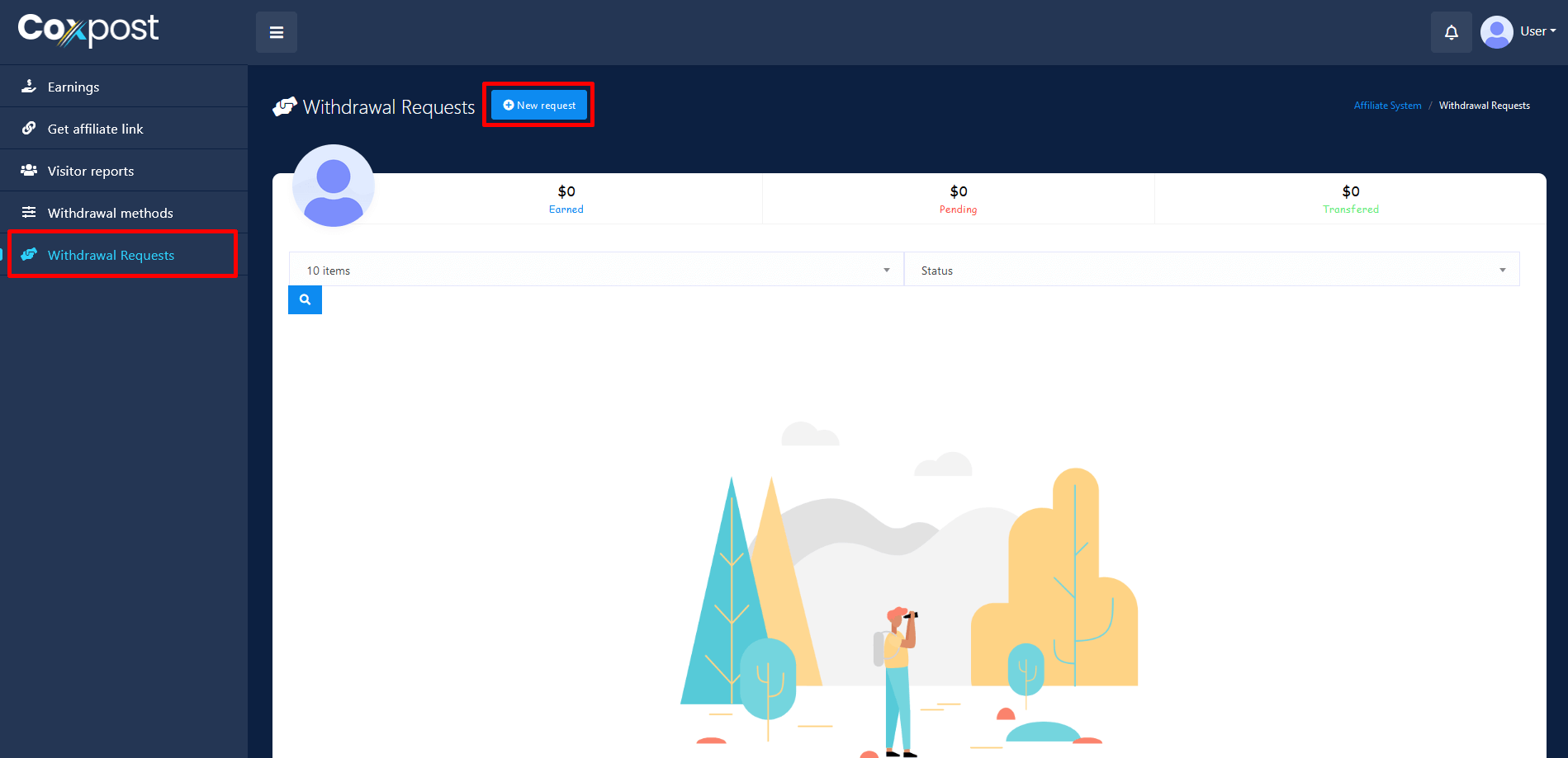 If you've earned commission by promoting the product, then you can simply add withdrawal requests by click on New Request button. A form will appear, select your method and provide the requested amount.