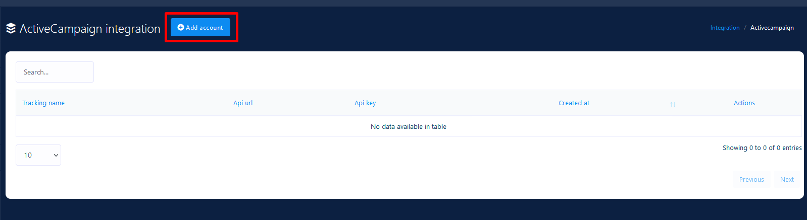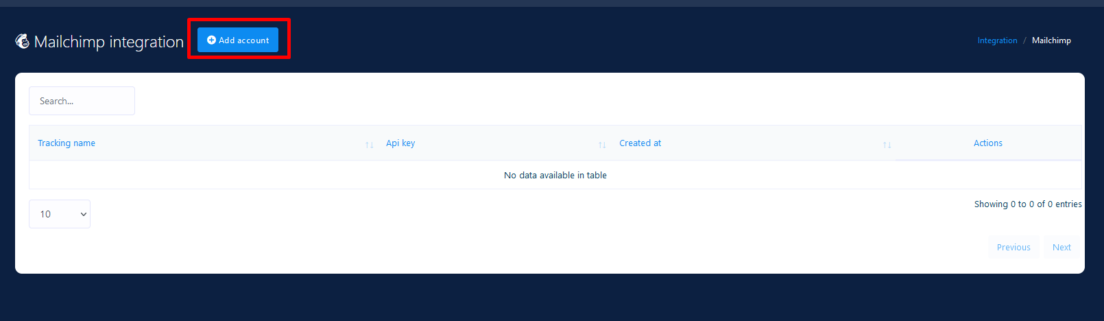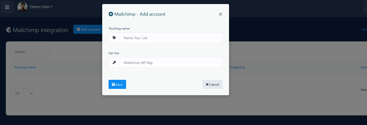 Click the Add Account button. A popup window will appear to put API key and Tracking Name. Please provide your MailChimp account API key and also give a name so that you can recognize it later.