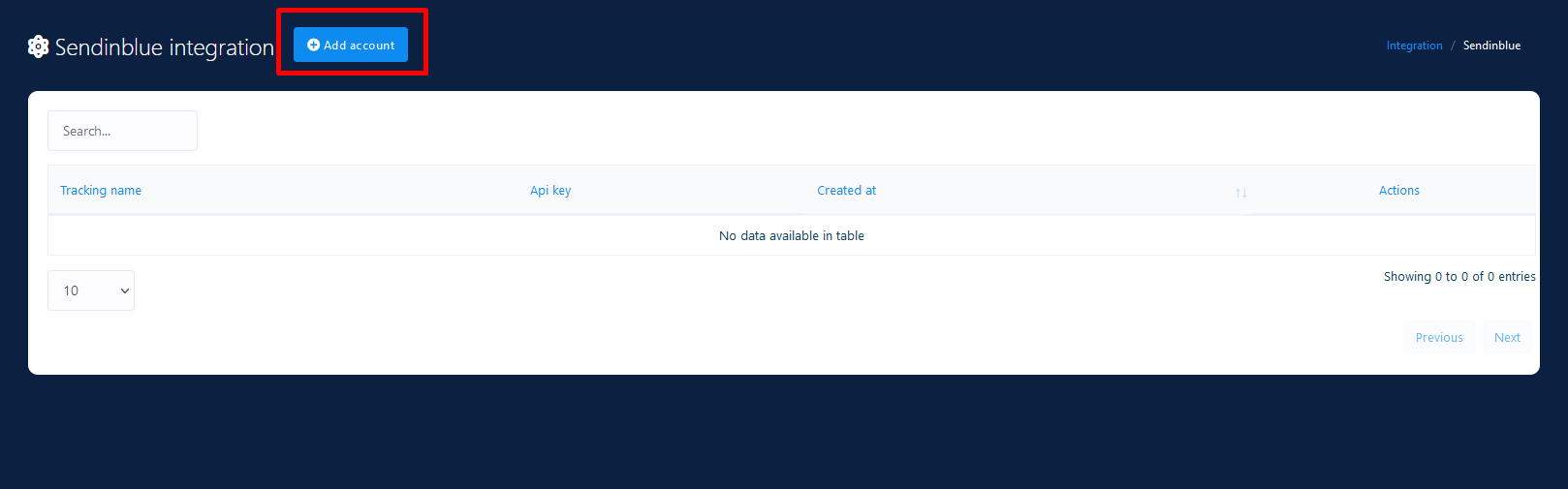 Click the Add Account button. A popup window will appear to put API key and Tracking Name. Please provide your Sendinblue account API key and also give a name so that you can recognize it later.