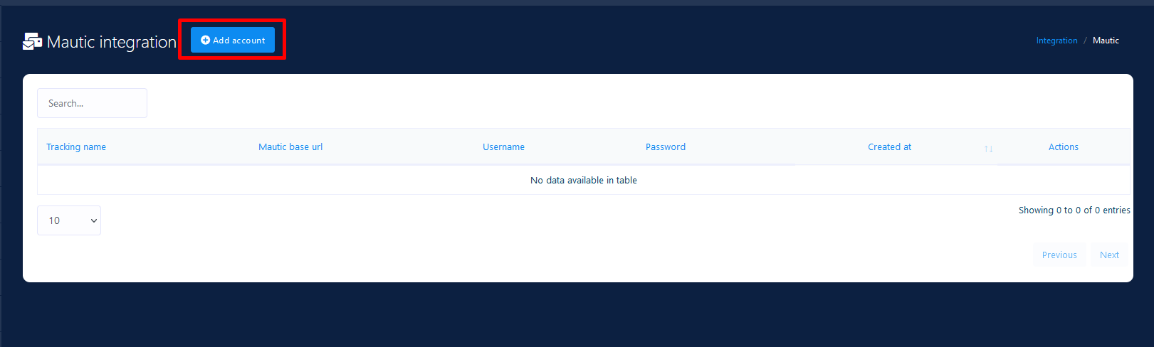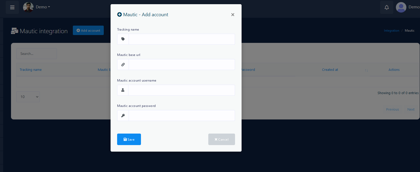 Click the Add Account button. A popup window will appear to put Tracking Name, Mautic Base URL, Mautic account username and Mautic account password. Please provide your Mautic Base URL, Mautic account username, Mautic account password and also give a name so that you can recognize it later.