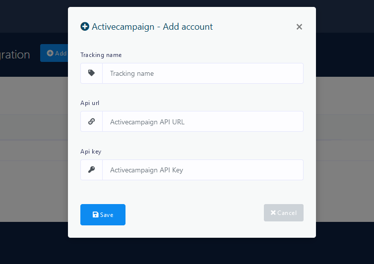 Click the Add Account button. A popup window will appear to put Tracking Name, API URL and API Key. Please provide your ActiveCampaign account’s API URL, API key and also give a name so that you can recognize it later.