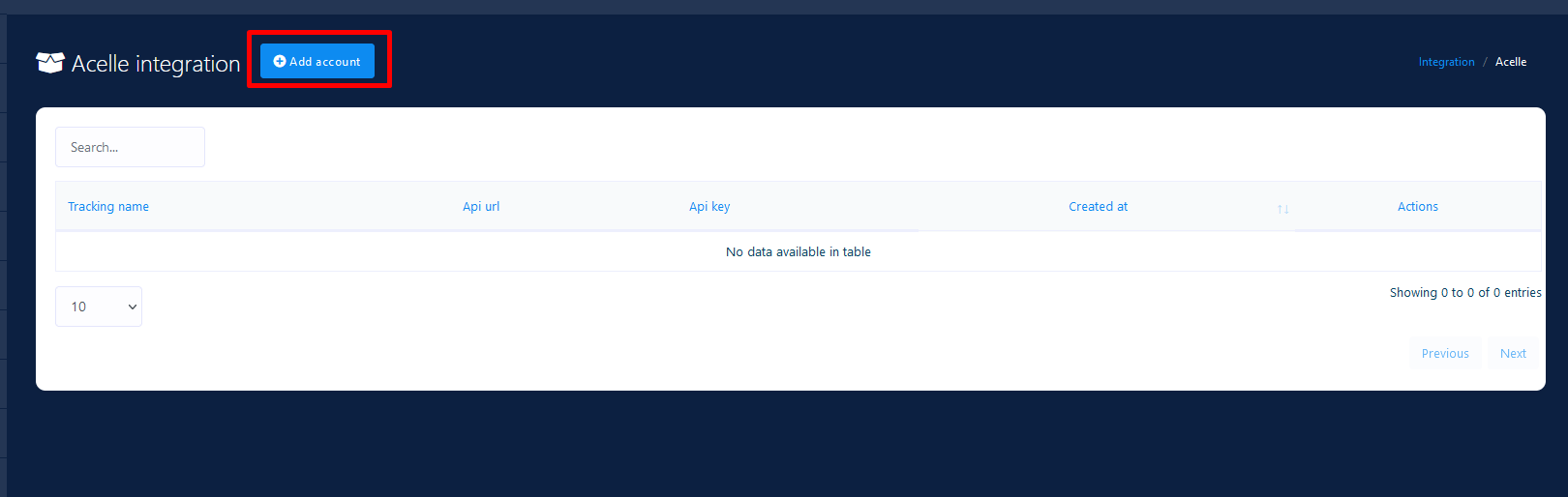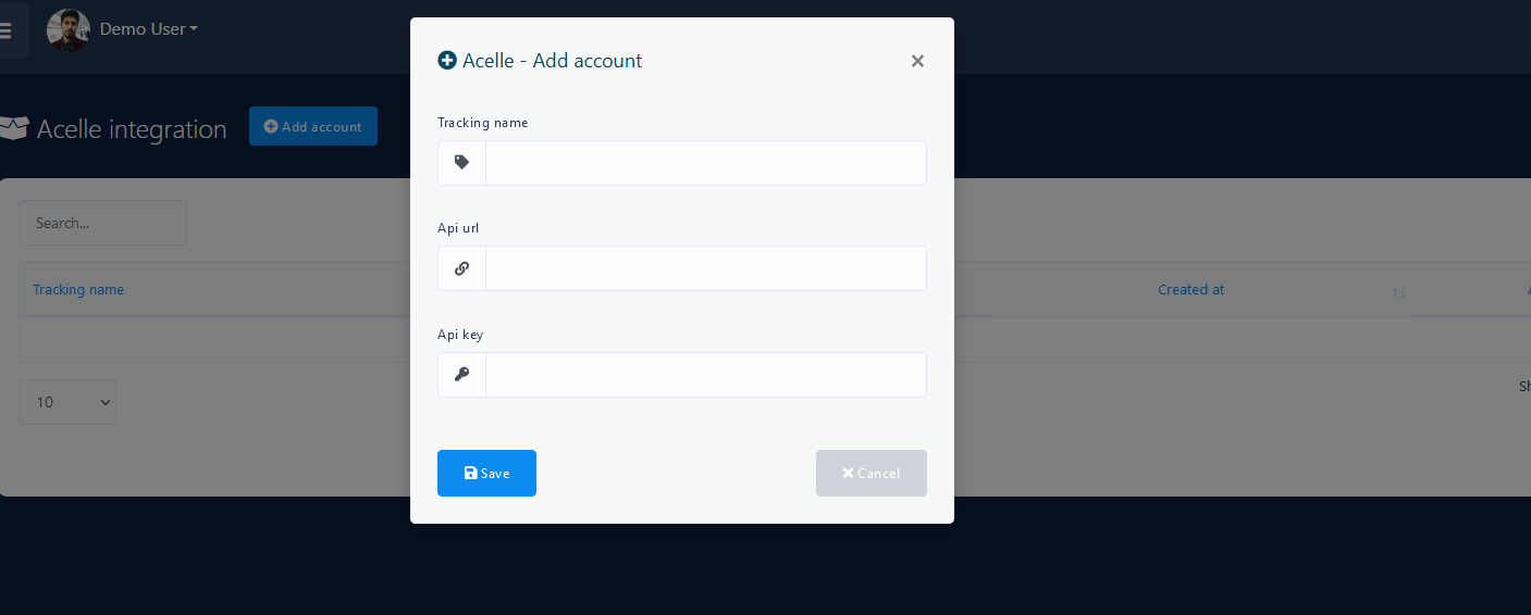 Click the Add Account button. A popup window will appear to put Tracking Name, API URL and API Key. Please provide your Acelle account’s API URL ( example: https://example.com/api/v1 ), API key and also give a name so that you can recognize it later.