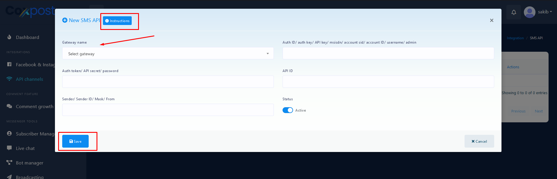 You can see what is need to add a SMS api by click on Instruction button from SMS API adding modal.
