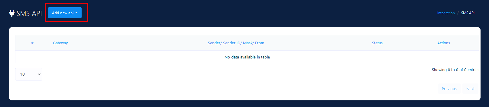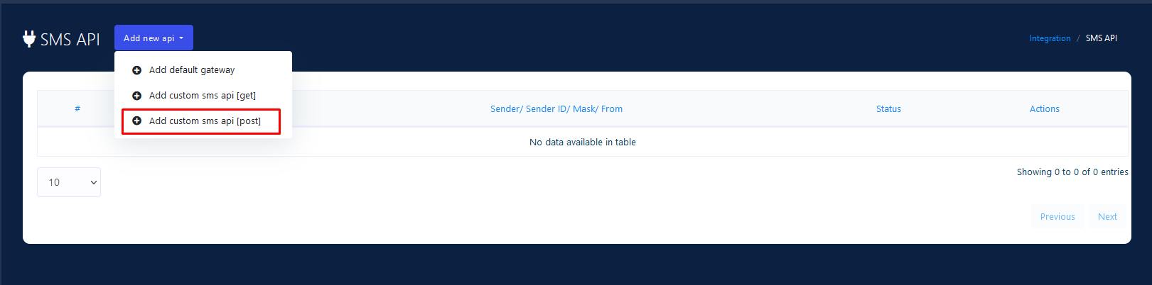 Go to API Channels -> SMS API Section -> HTTP GET/Post option. You'll be redirected to the SMS API management section. Click on the Add SMS API -> Add Custom SMS API [POST] - #Step 2