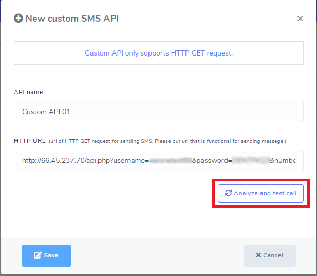 Now click the “Analyze and test call” button. It will call the url, you just provided, and show you the response of sending message using that url.