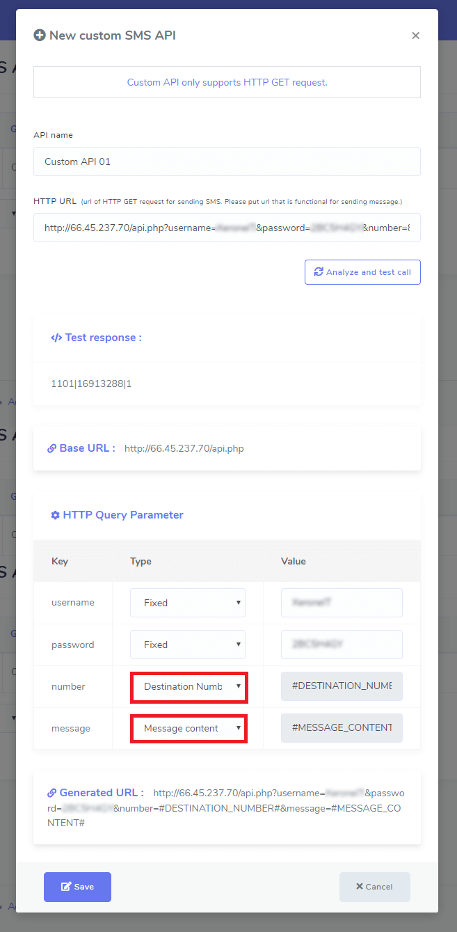 You just have to change the parameter type for Destination Number and Message Content . While changing these parameters type, you will notice that new value has replaced on your newly generated custom API url. When you will send SMS through this custom API then these contents will be replaced by your given contents. - #Step 4