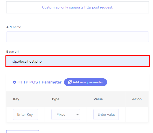 Fill the API name and Base url fields.