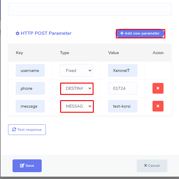 Now click the “Test response” button. It will call the url, you just provided, and show you the response of sending message using that url and the provided post parameter .The parameter is included with key, type and value.
