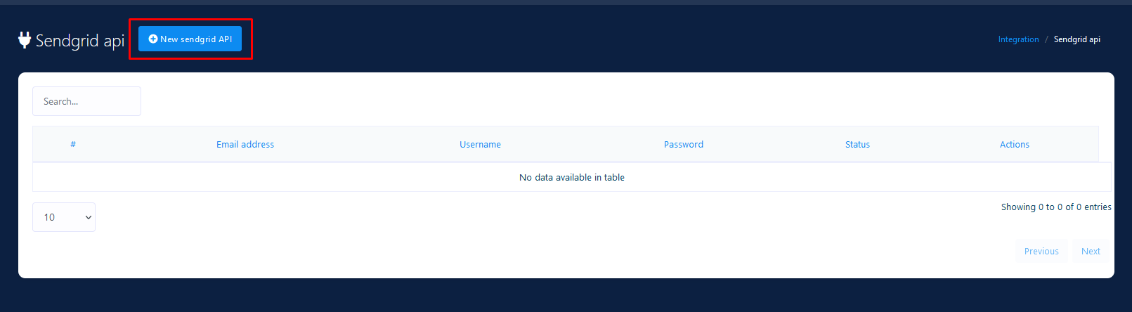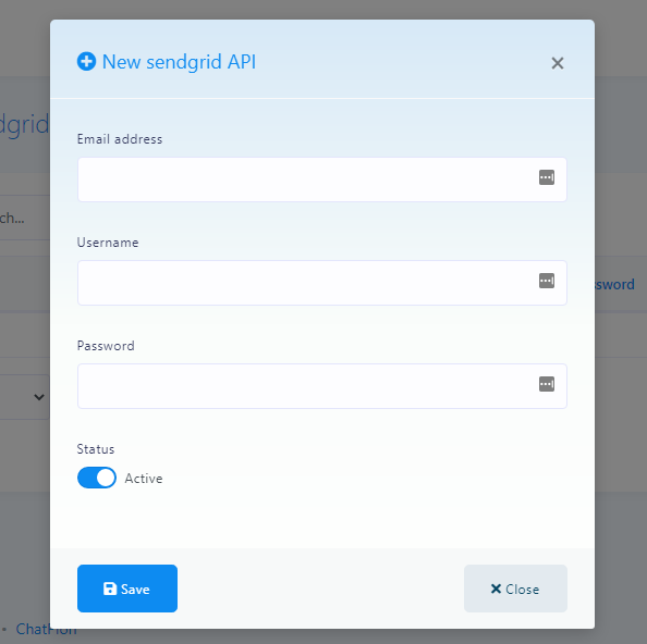 Click on New Sendgrid API and a modal will appear to add sendgrid api. Fill up the form with necessary information and hit Save button.