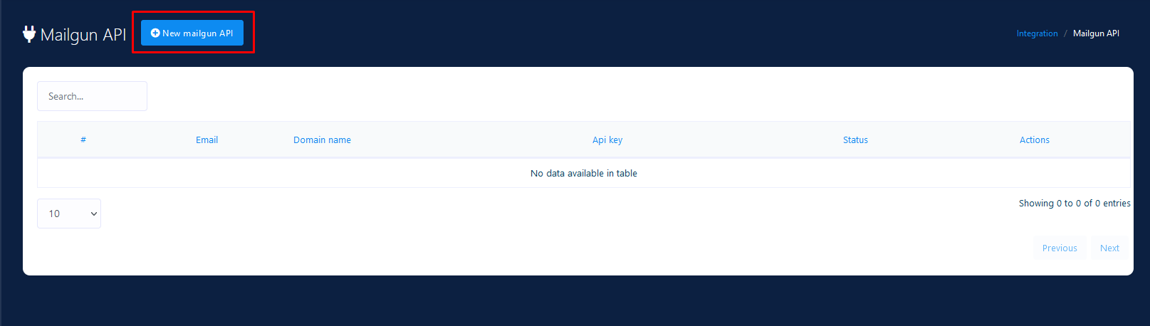 Click on New Mailgun API and a modal will appear to add sendgrid api. Fill up the form with necessary information and hit Save button.