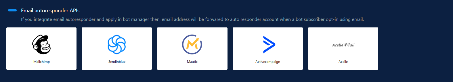 By integrating ActiveCampaign, all the emails collected from messenger Quick Reply or user’s sign up will automatically be added to your desired ActiveCampaign list.