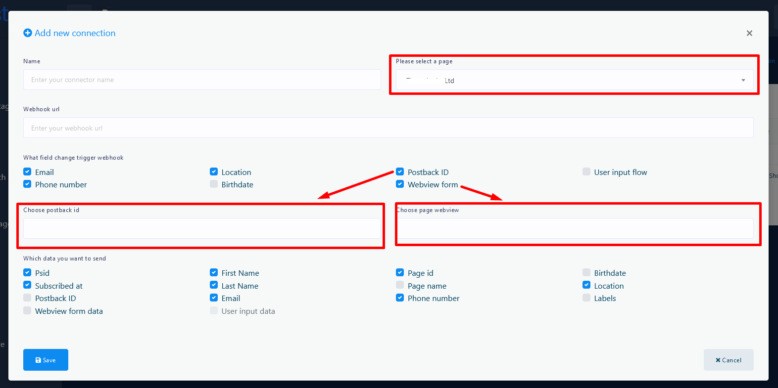 What field change trigger webhook: There are six triggering options in this section : email, phone number, location , postback , birth date and webview form. As for example : if you select email, so when any new email is collected through quick reply of messenger bot, then webhook will be triggered. You can select all options together and then the webhook will be triggered for all the events. Postback event will require to choose the postback ids and webview event will require to choose webview form ids.