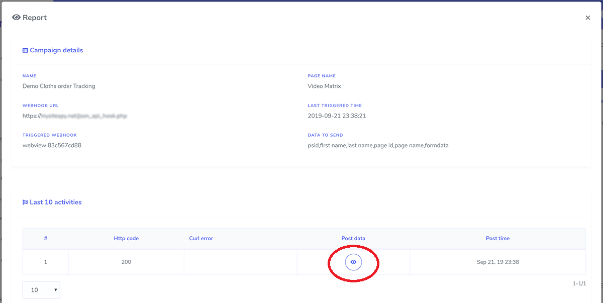Just click on the view button and see last 10 activities of you connection as well as connection setup information. HTTP Code: 200 means connection triggered successfully. You can see the data list in Post Data section which was send when the connection is triggered.