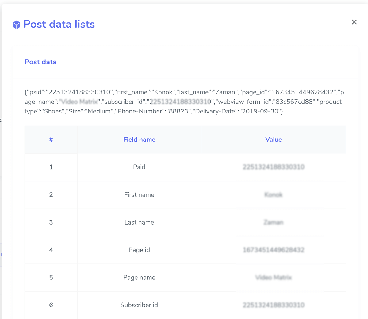 Which data you want to send: There are different options of data of the user which are collected through quick reply and system will send selected data during triggering. A sample data will look like below: