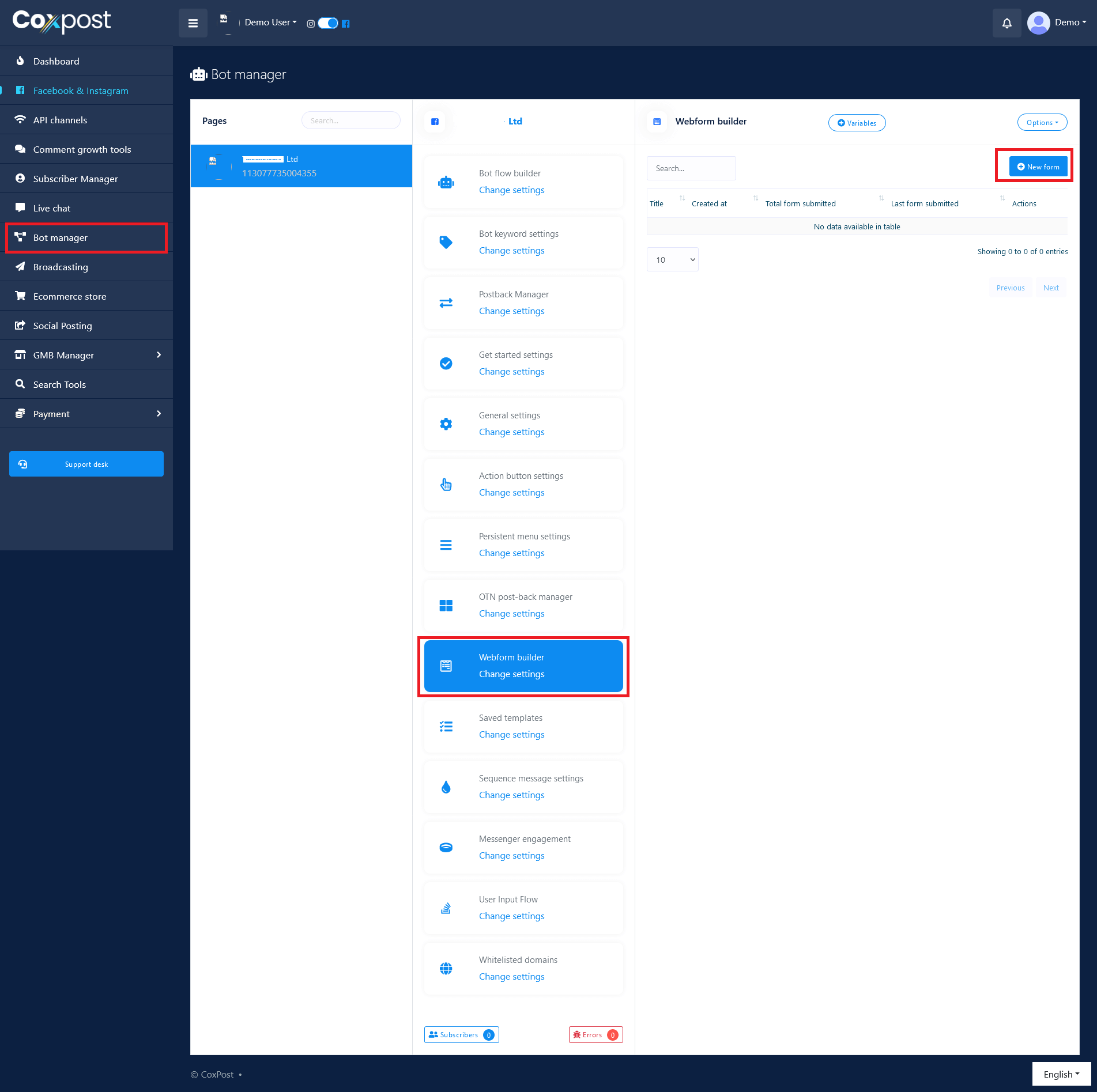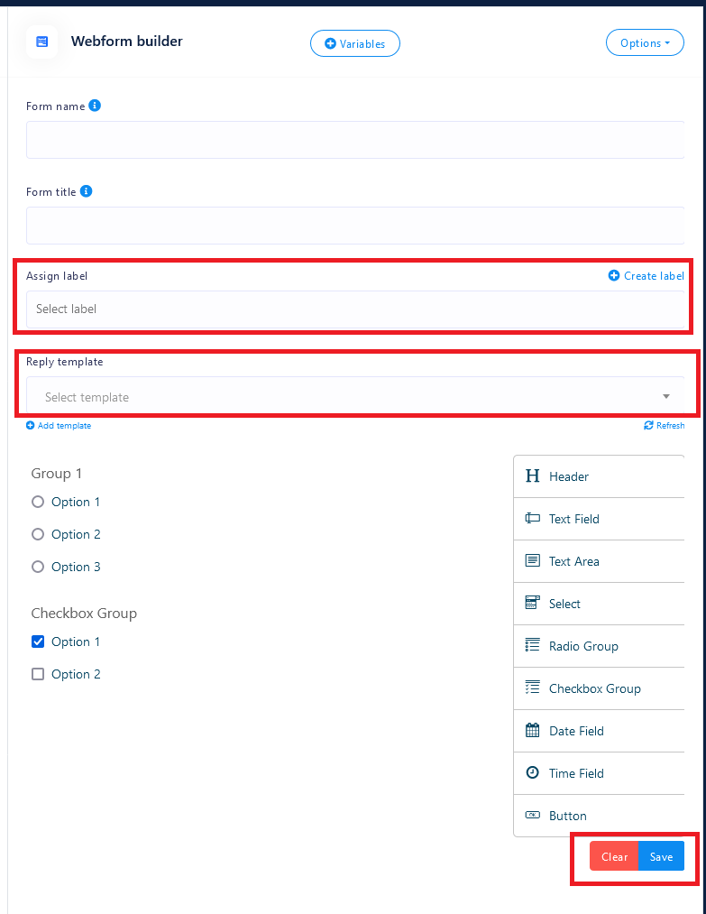 To create a new webview form simply click Create new form button. This is a drag and drop form builder. Choose form name, title, page. You choose optional label and reply template. When people will submit the form they will be assigned to the selected labels and also they will receive the inbox reply.
