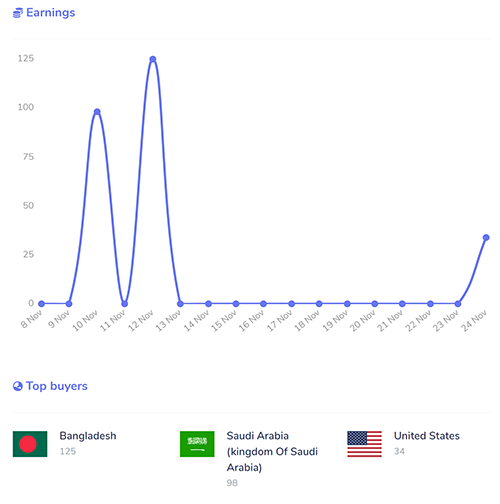 The dashboard also shows earnings using a line graph breaking into days as well as top buyer countries.