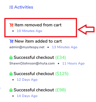 This block shows all the cart activity triggered on your WooCommerce store whenever a new item added to cart, an item removed from cart and successful checkout event. Clicking a specific activity will open a dialog to show details of that activity in a detailed cart format like below. If the activity is a successful checkout then it also shows the confirmation message report at the bottom of the dialog.