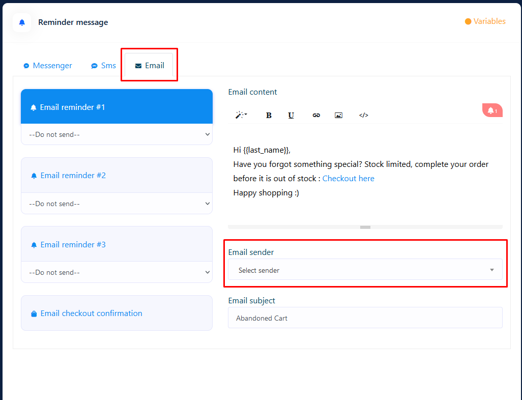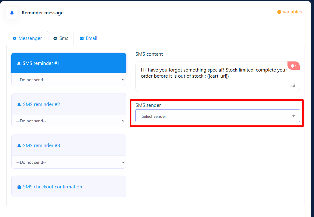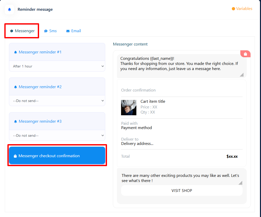 It supports 3 types of messages : Facebook Messenger, SMS and Email. You can send reminder message 1 to 23 hours from the time a visitor starts a cart. You can set maximum 3 reminders for each type of channels at any hour you want. You can send them checkout confirmation message as well. Message can have these variables :