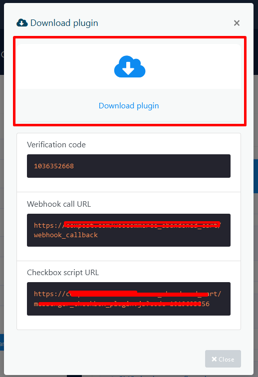 After you save your preferences, a dialog will open that will have link to download the WooCommerce plugin for your store. The dialog will also contain the configuration data used to generate the plugin. You do not need to do anything with the configuration data. You can just install the plugin in your WordPress admin panel.