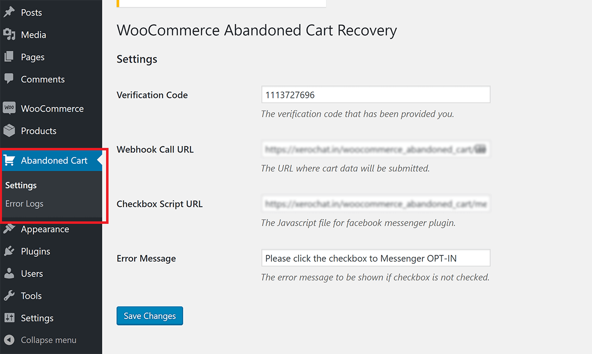 After you install the plugin you can see a menu in your WordPress admin panel called "Abandoned Cart" having two submenus. The first submenu shows the same configuration values and the second one shows if there was any error during a cart activity. Again, you do not need to do anything with the configuration data.
