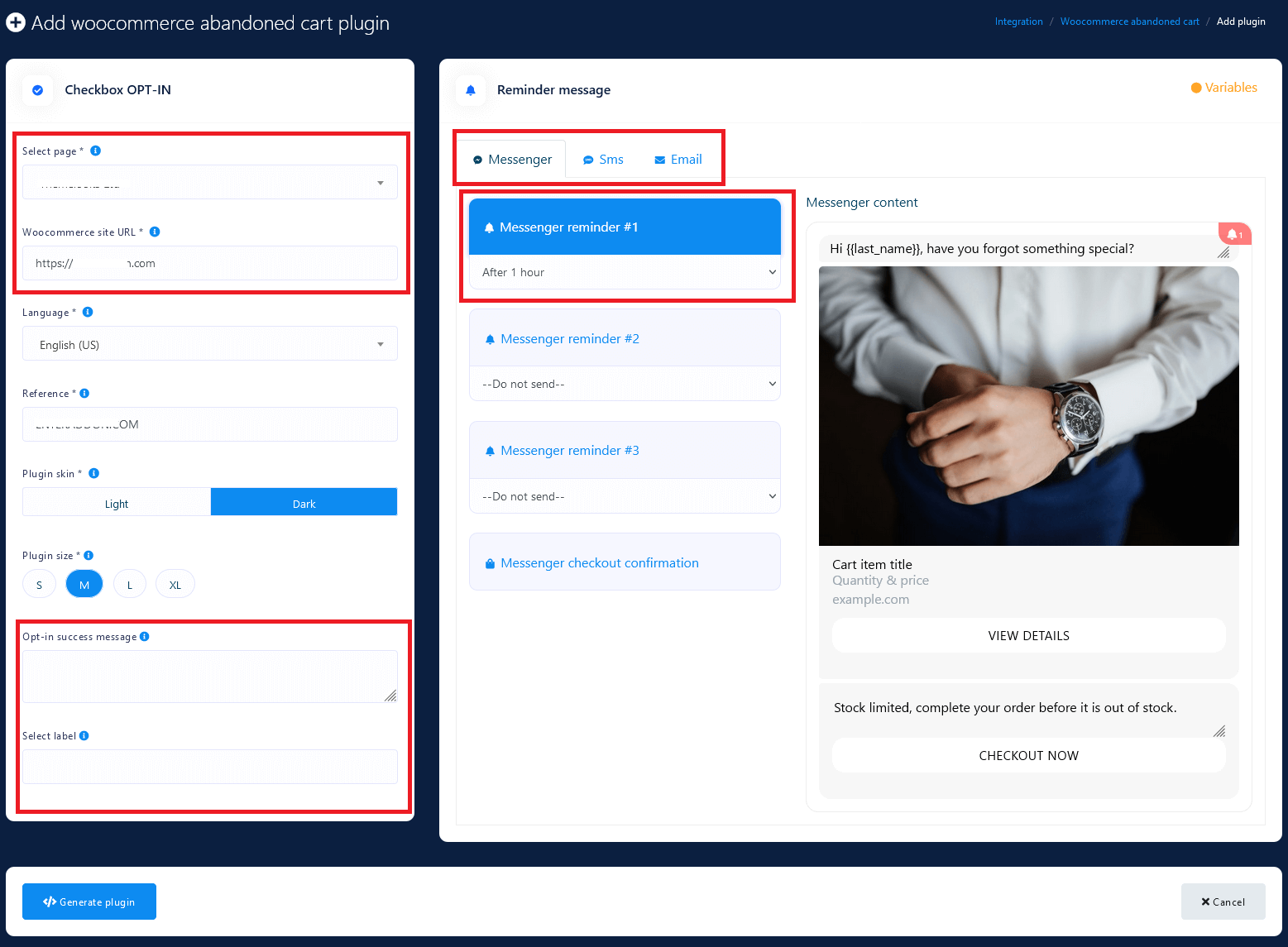 Click the Create Plugin button at the top block to create a new plugin for your WooCommerce store. Creating a plugin a very easy, you just need to choose some options and set your reminder message as well as checkout confirmation message. This feature uses Facebook Messenger Checkbox Plugin to OPT-IN. You need to select a Facebook page to connect it with you WooCommerce store domain. You can choose labels and whenever anyone optin they will be assigned to the labels. Also you can choose optin success message to interact with visitor.