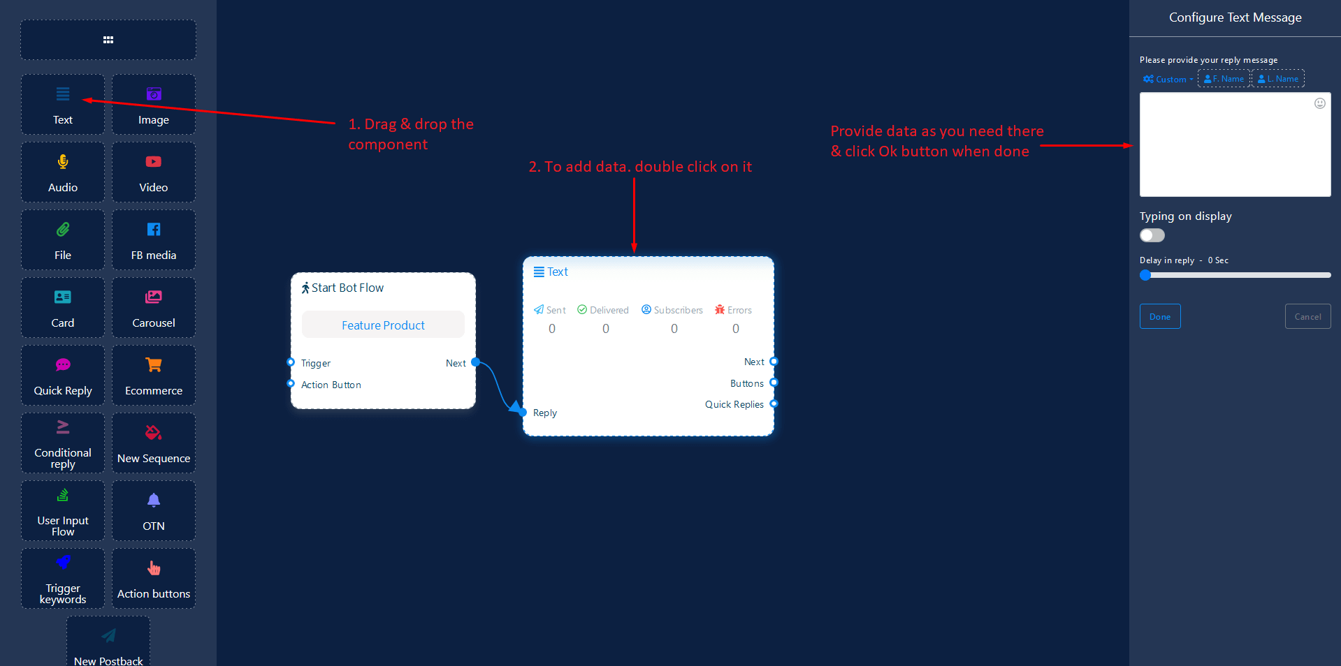 - Start Bot Flow, New Postback, Text, Carousel, Facebook Media, Image, Video, Audio, File, Generic Template, E-commerce, OTN
