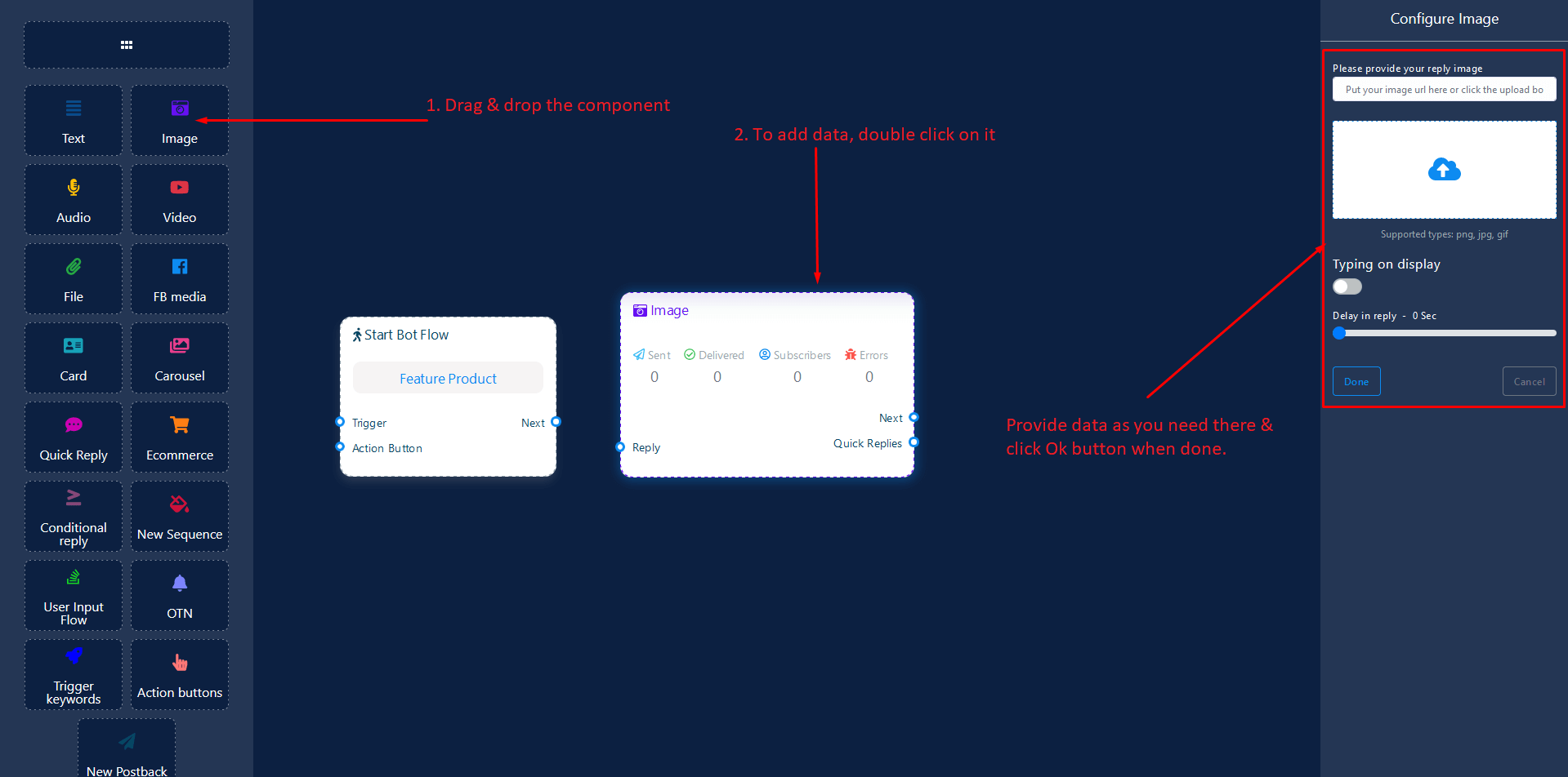 - Start Bot Flow, New Postback, Text, Carousel, Facebook Media, Image, Video, Audio, File, E-commerce, Generic Template, OTN