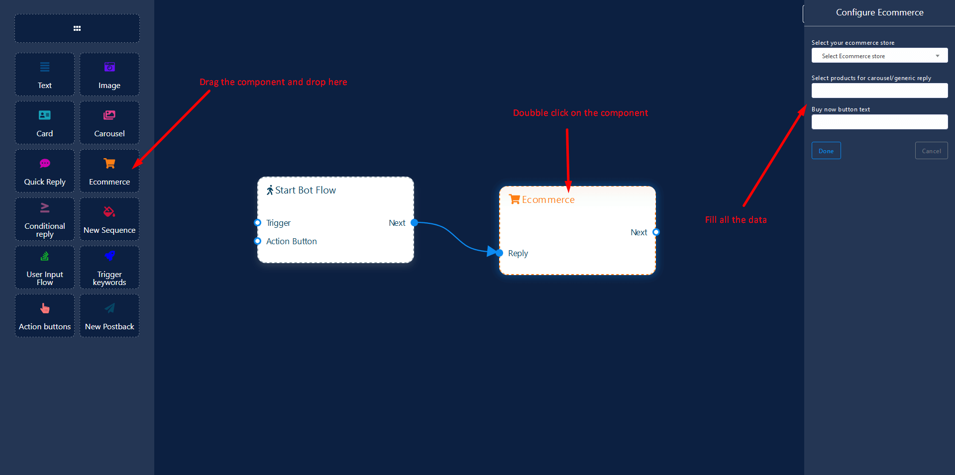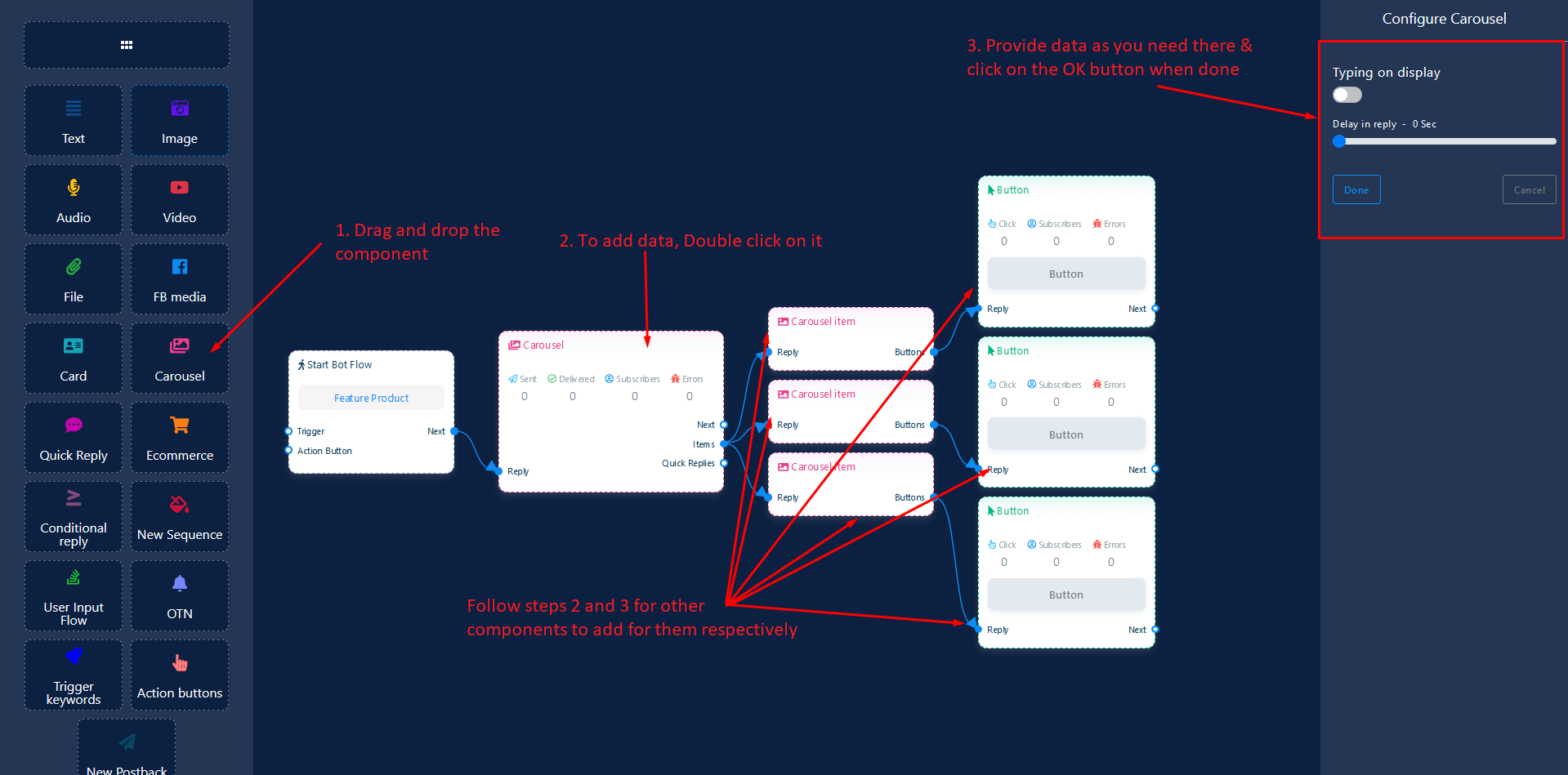 To add data to the Carousel component, click twice on the body of the Carousel component. It will open a sidebar on your right with only fields asking reply-delay and type-state. Interact with them if you need.