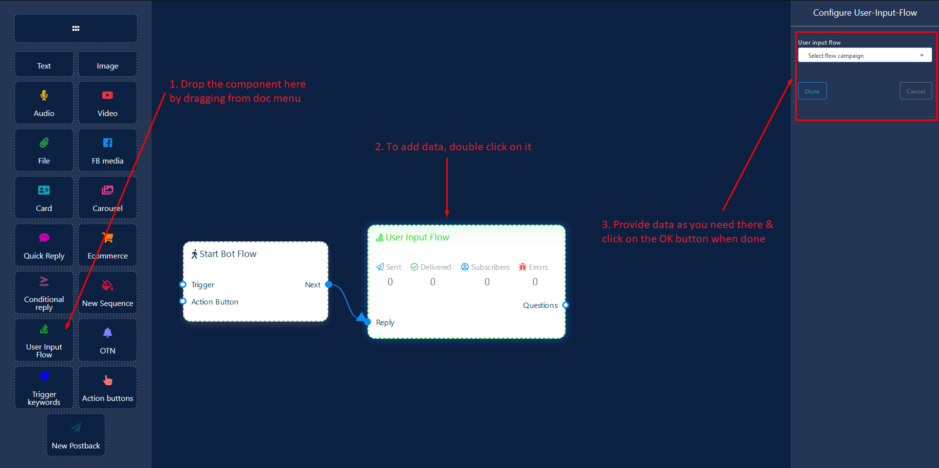 From the dock menu, drag the UserInputFlow component and drop it on the editor at any place.