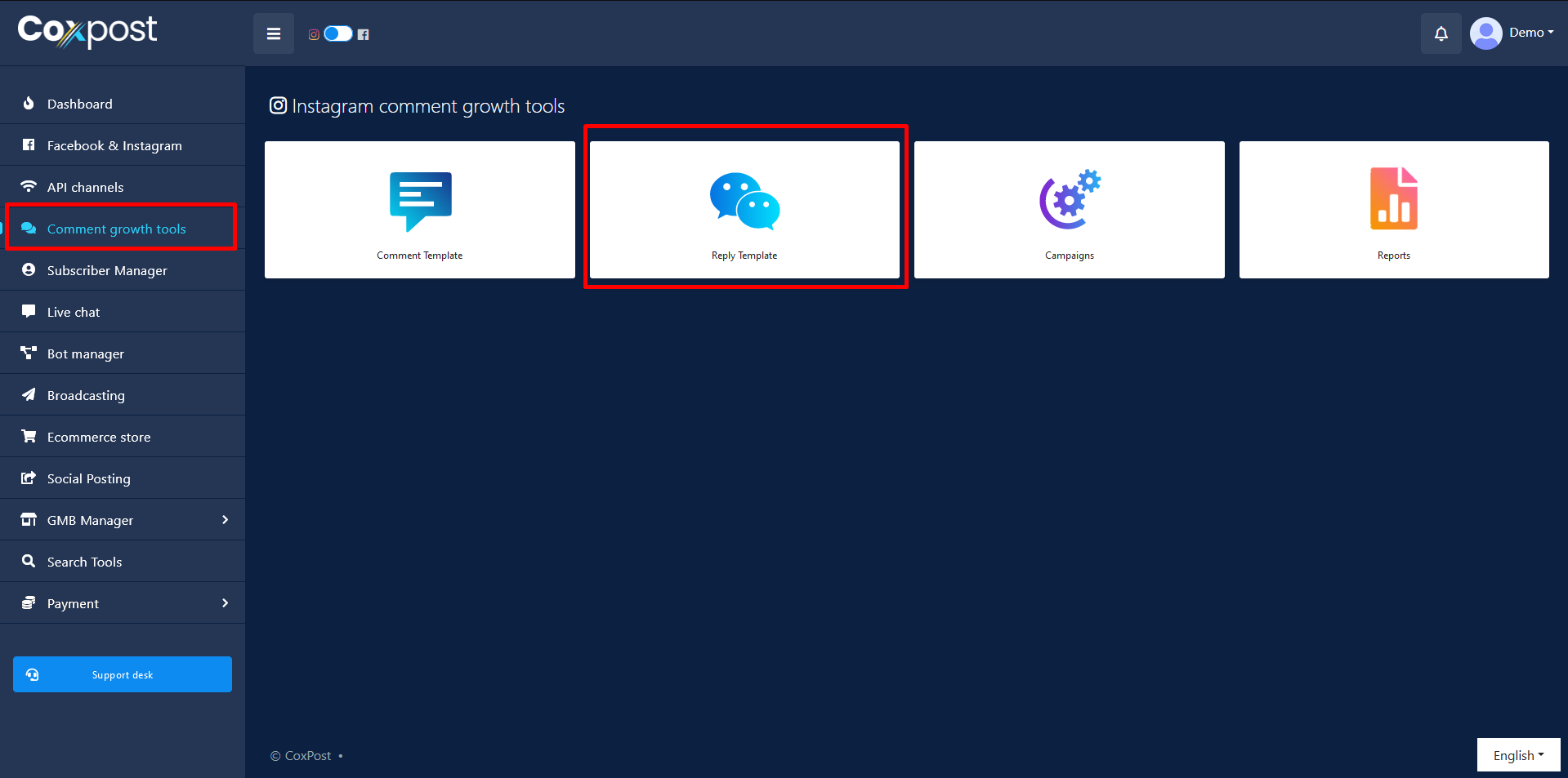 First, click on the Comment Growth Tools option at the left sidebar of the CoxPost Dashboard. Without delay, the Comment Growth Tools page will appear. The page is divided into two sections— Facebook and Instagram.
