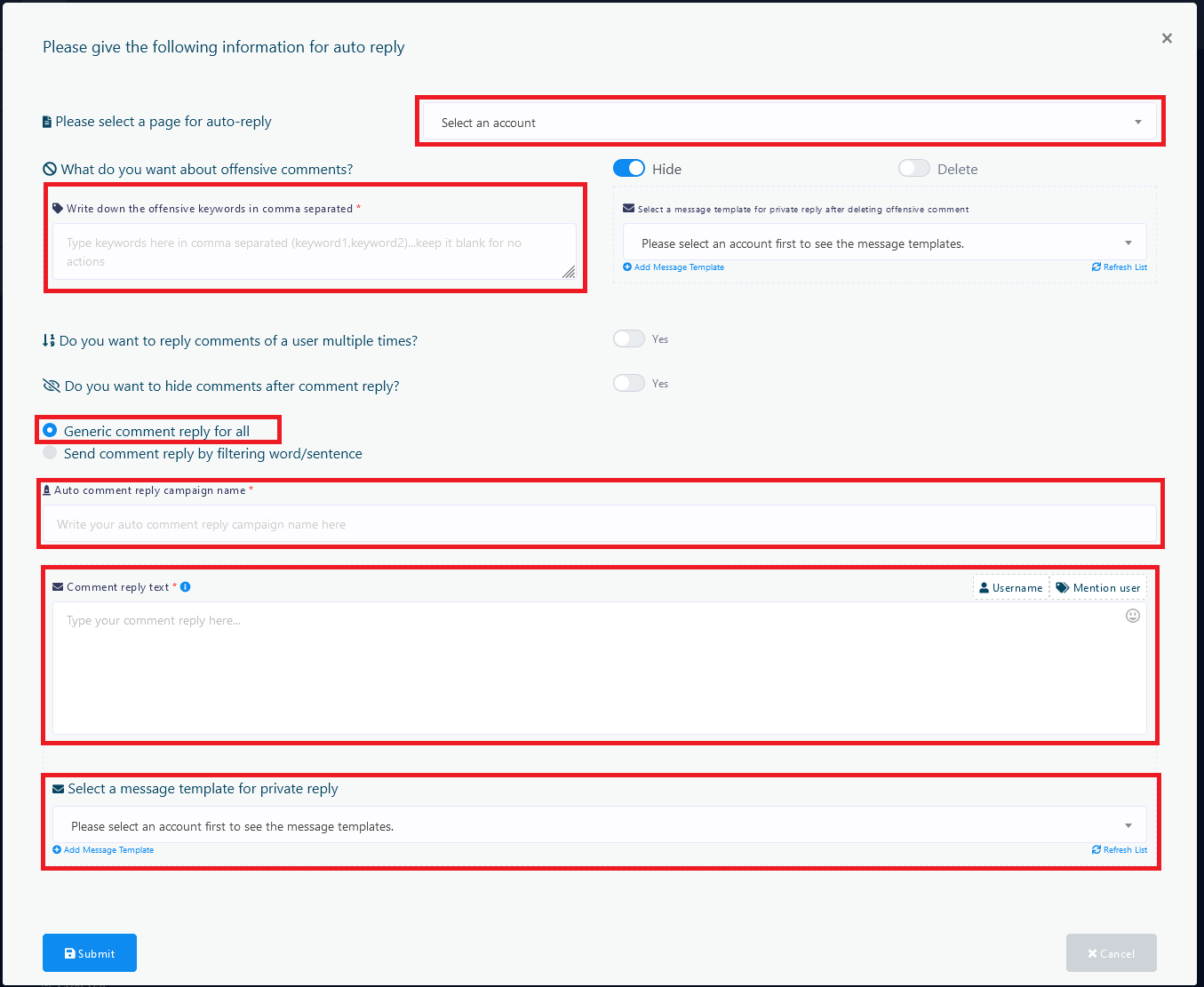 If you want to hide an offensive comment, select the Hide radio button. On the other hand, if you want to delete an offensive comment, select the Delete radio button. Then provide offensive keywords in the form. Now you have to select a message template for Private Reply from a drop-down menu.