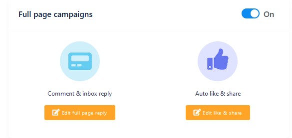 You will find this block under Comment Automation > Automation Campaign menu. Here you can set comment & inbox reply campaign and auto like & share campaign for full page. The term "full page" means one settings will work for whole Facebook page. It's a webhook based quick process.