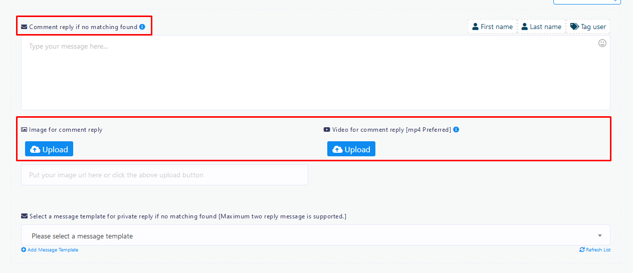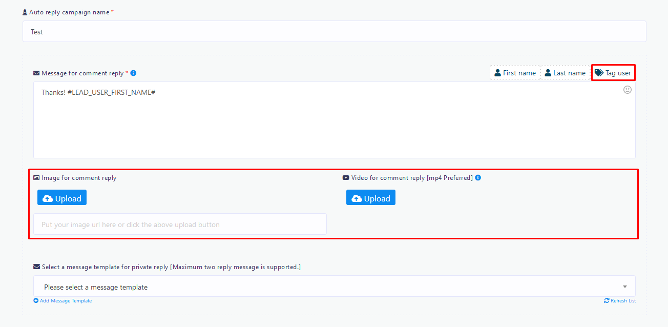 Now on you can send image or gif or even video as comment reply. You will find the section below in full page auto reply campaign page as well as post wise auto reply campaign page. Simply upload an image to reply or upload a video instead. You can put image url directly if you want, this can be useful for GIF reply.