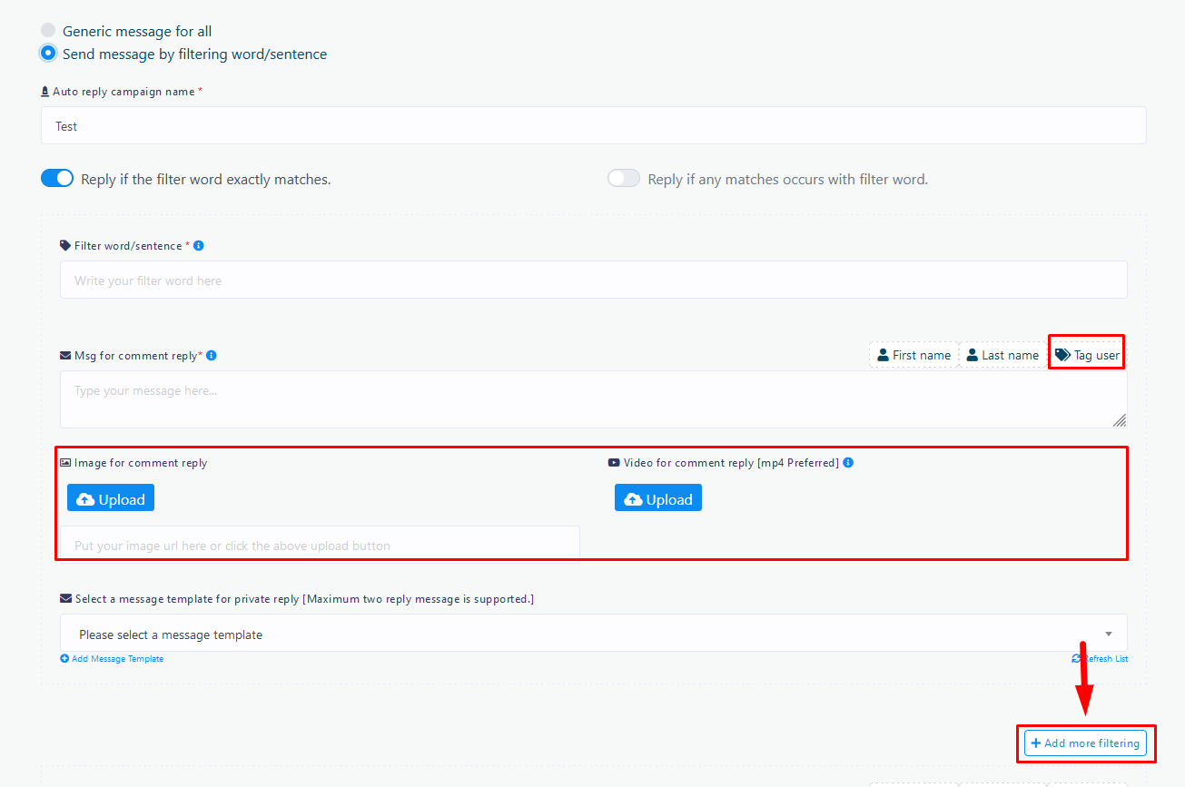 If you choose this option then you can define multiple comma separated filtering word/sentence like if someone comment "hi or holla" it will reply "hello", if someone comment "thank you" it will reply "welcome". You can add up to 20 filtering word sets. The reply supports spintax and you can embed commenter name variable inside reply message. Tagging user is also possible for comment reply only, not for inbox private reply. Also you can set a reply if no filtering word match found, a generic reply for rest of comments.