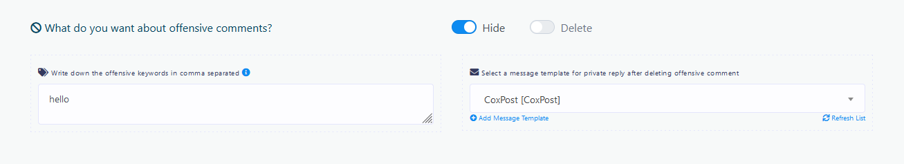 You will find this settings "What do you want about offensive comments?" in full page auto reply campaign page as well as post wise auto reply campaign page. You can hide them or can delete them or can leave them as you wish. If you choose to hide/delete them then you need to put comma separated keywords that you think is offensive. Whenever any comment contains any of the offensive words then it will be hidden or deleted according to option you choose. You can also send inbox reply to that user whose comment has been deleted.