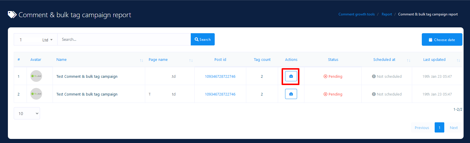 In this example report it shows a campaign for a post and it says it has been completed and has bulk tagged 2 people. Clicking the briefcase icon will expand action buttons : report, edit, see attachment and delete campaign. Completed and campaign in processing cannot be edited. Campaign in processing cannot be deleted. The next image shows the report in detail.