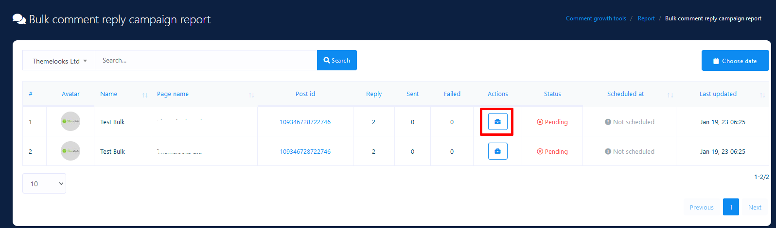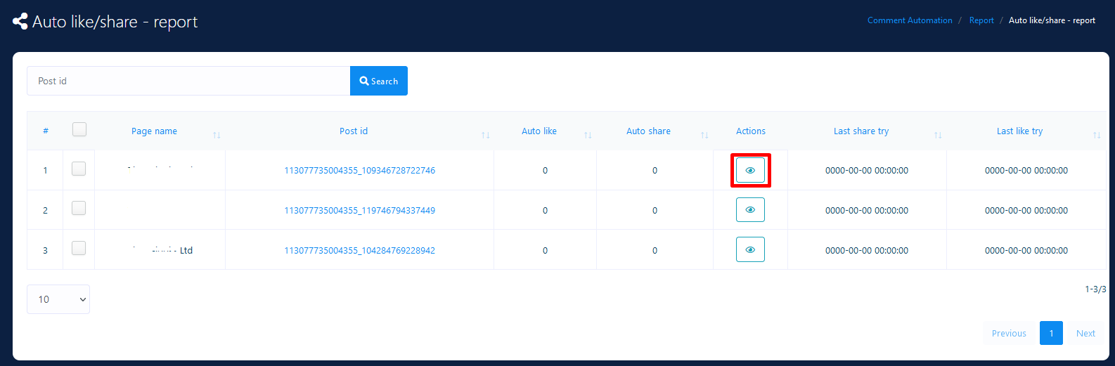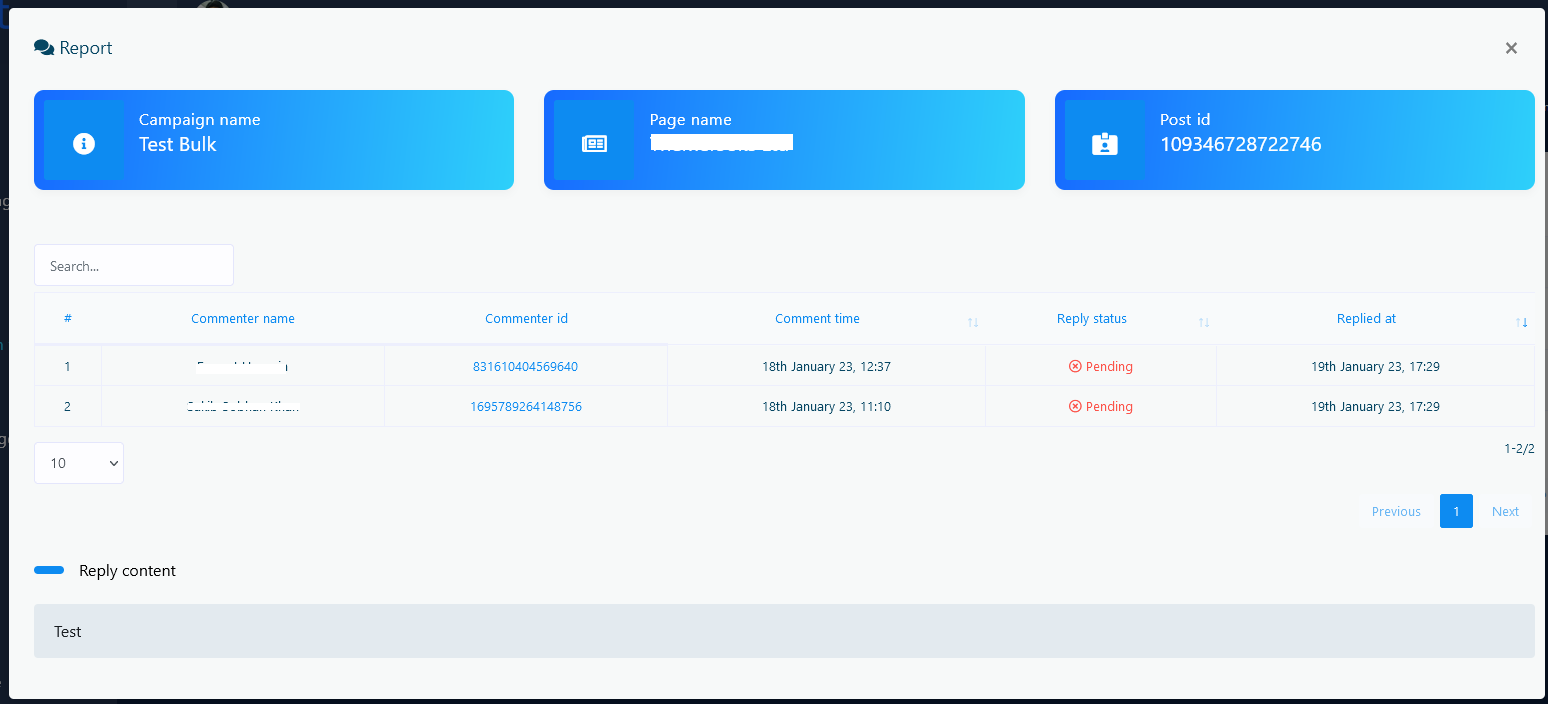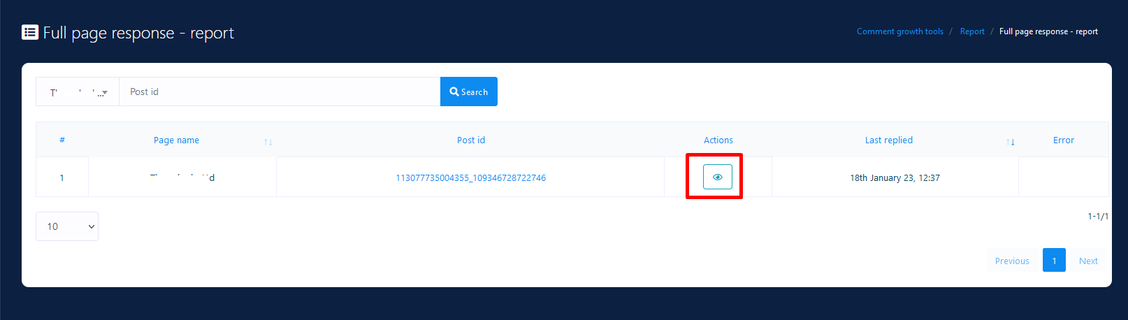 In this example report it shows campaign for 3 posts and you can see when they last replied or if there was any error. Clicking the eye icon will show report in detail.