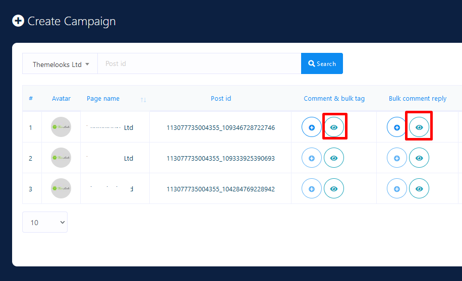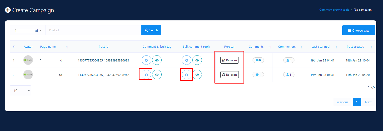 Then go to Comment Automation > Tag Campaign menu and you will see all tag campaign enabled posts there. You can see comments and commenters count in each row, to re-sync new comments click "Re-scan" button. You can see couple of plus & eye sign buttons. Plus icon is for creating new campaign and the eye sign is for viewing report. The first button set is for Comment & Bulk Tag and the second button set is for Bulk Comment Reply.