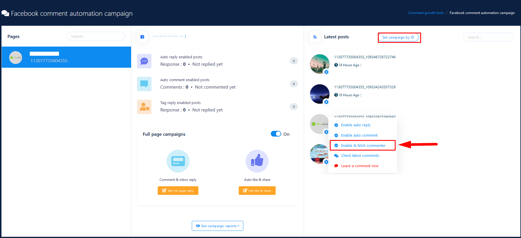 First go to Comment Automation > Automation Campaign and click "Enable & Fetch Commenter" to enable tag campaign for the posts you want from the list of recent post, you can also enable tag campaign from "Set Campaign by ID"