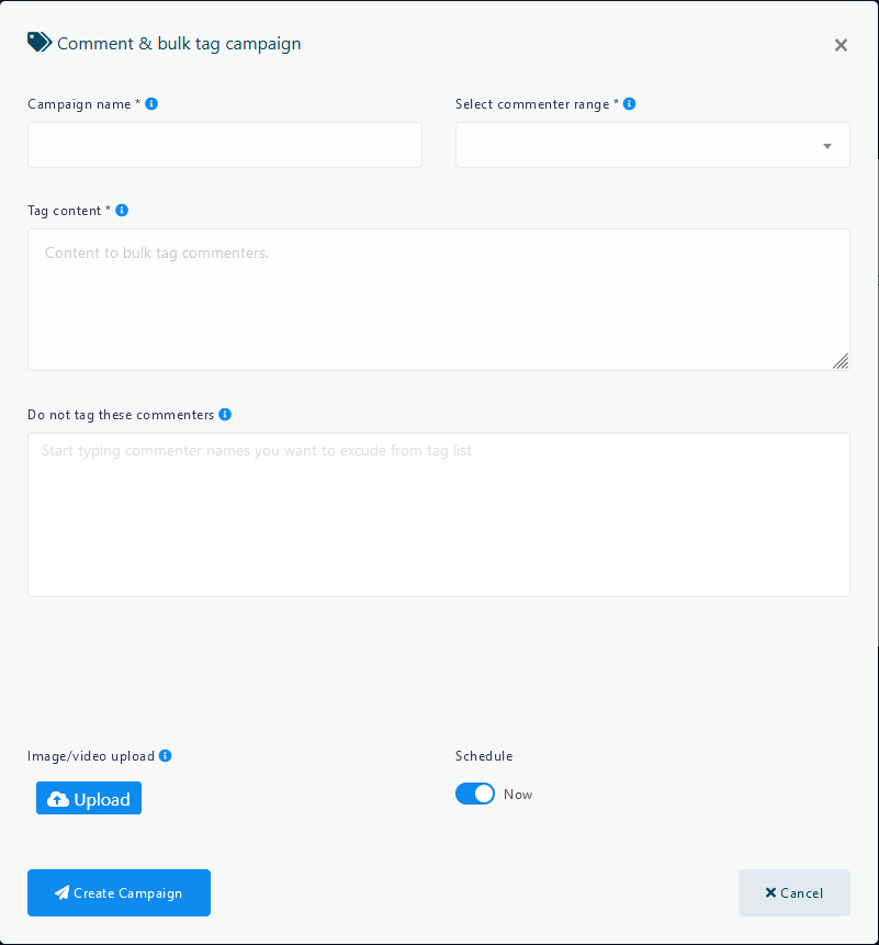 Campaign creation for "Comment & Bulk Tag" requires at least two commenters and campaign creation for "Bulk Comment Reply" requires at least one comments, otherwise the campaign creation buttons will be disabled.