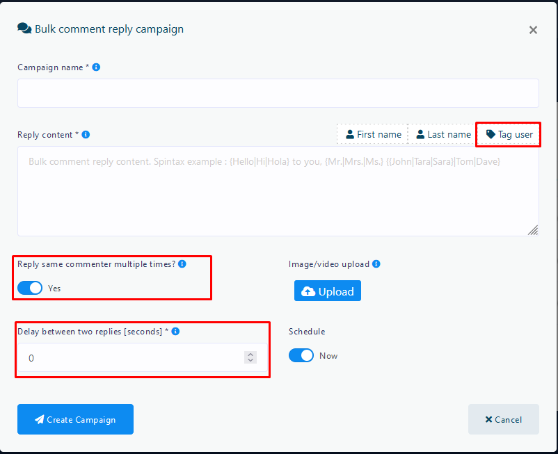 All the commenters will get notification about your comment & they will visit it again. You can make your post viral again as the post will again start to display in people feed and also friends of commenters. To do so all you need to create an easy campaign. You can also exclude specific person from tagging. Multimedia reply and campaign scheduling is available.