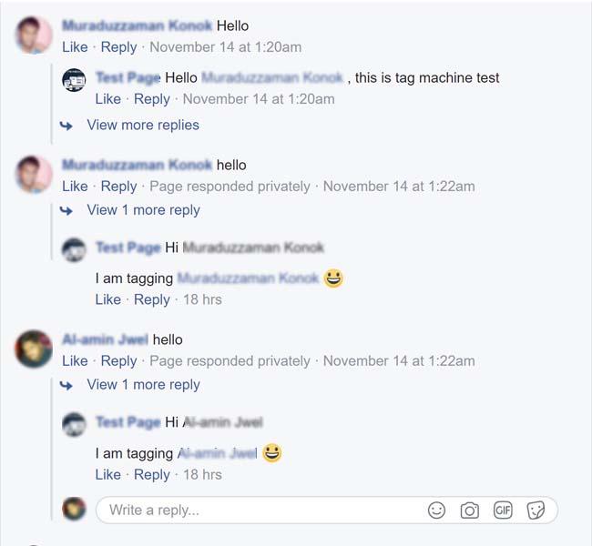 Mentioning commenter in reply will make it more personalize and notification will be sent to each commenter. Suppose your post have 1K comments and you want to reply them all mentioning commenter name. You can do this by simply creating an easy campaign. Just put the comment content to post. When the campaign is complete you can see 1K reply as your page tagging commenter like the example below. You can also choose if you want to reply same commenter multiple times (if same people commented multiple times). Using enough delay is very important to avoid being marked as spam by Facebook. Multimedia reply is available.