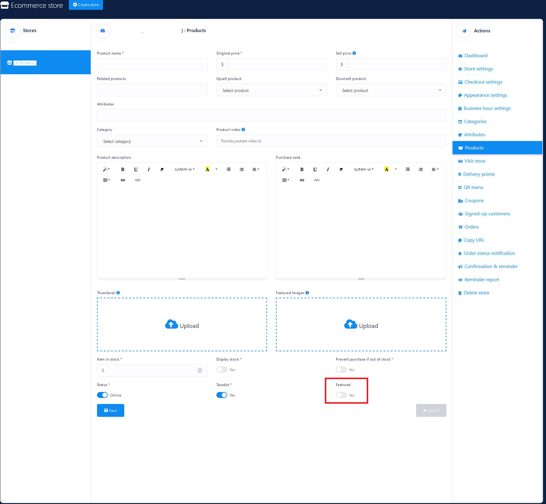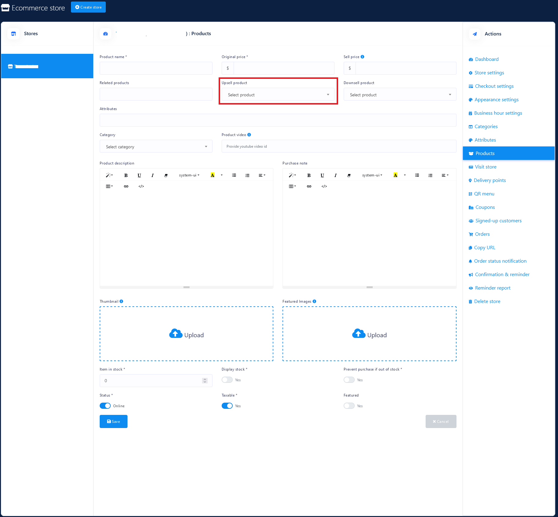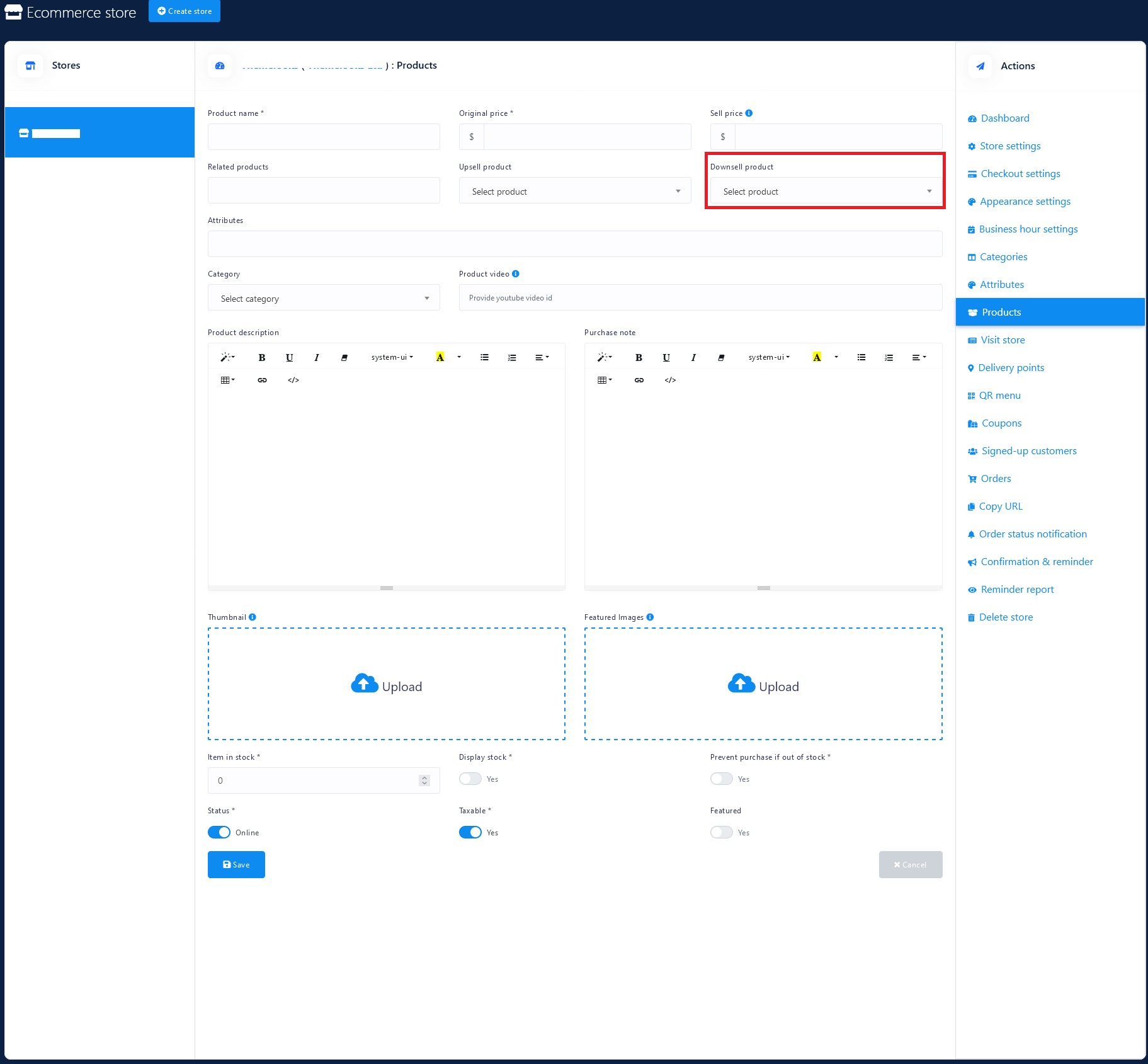 Please Visit your e-commerce store and click on the Products menu from the right-sided sidebar. Now click on the Add buttons from the section to add downsell product for the product. Or you can also update an existing Product to add downsell product to that product.
