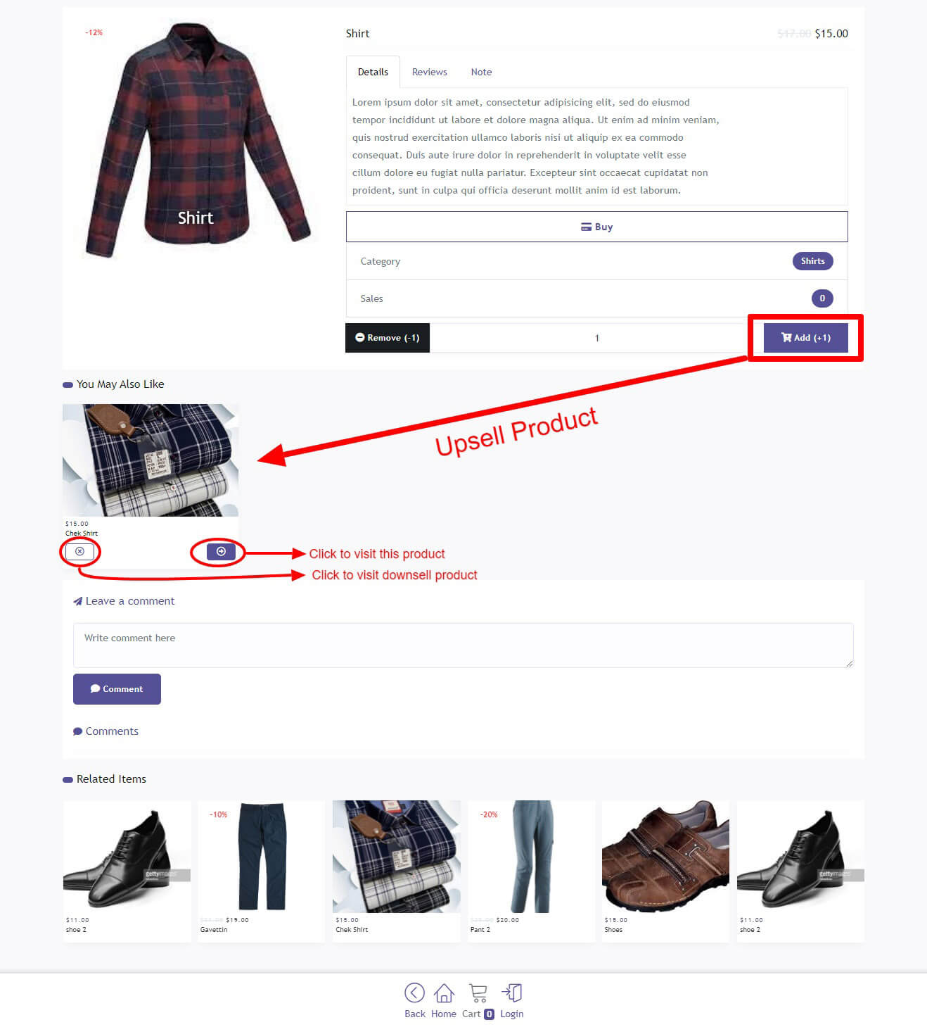 Click on the Continue button of the upsell product to visit the product. If you click on the Cancel button of the upsell product, system will redirect to the corresponding downsell product page if the visited product has any downsell product.
