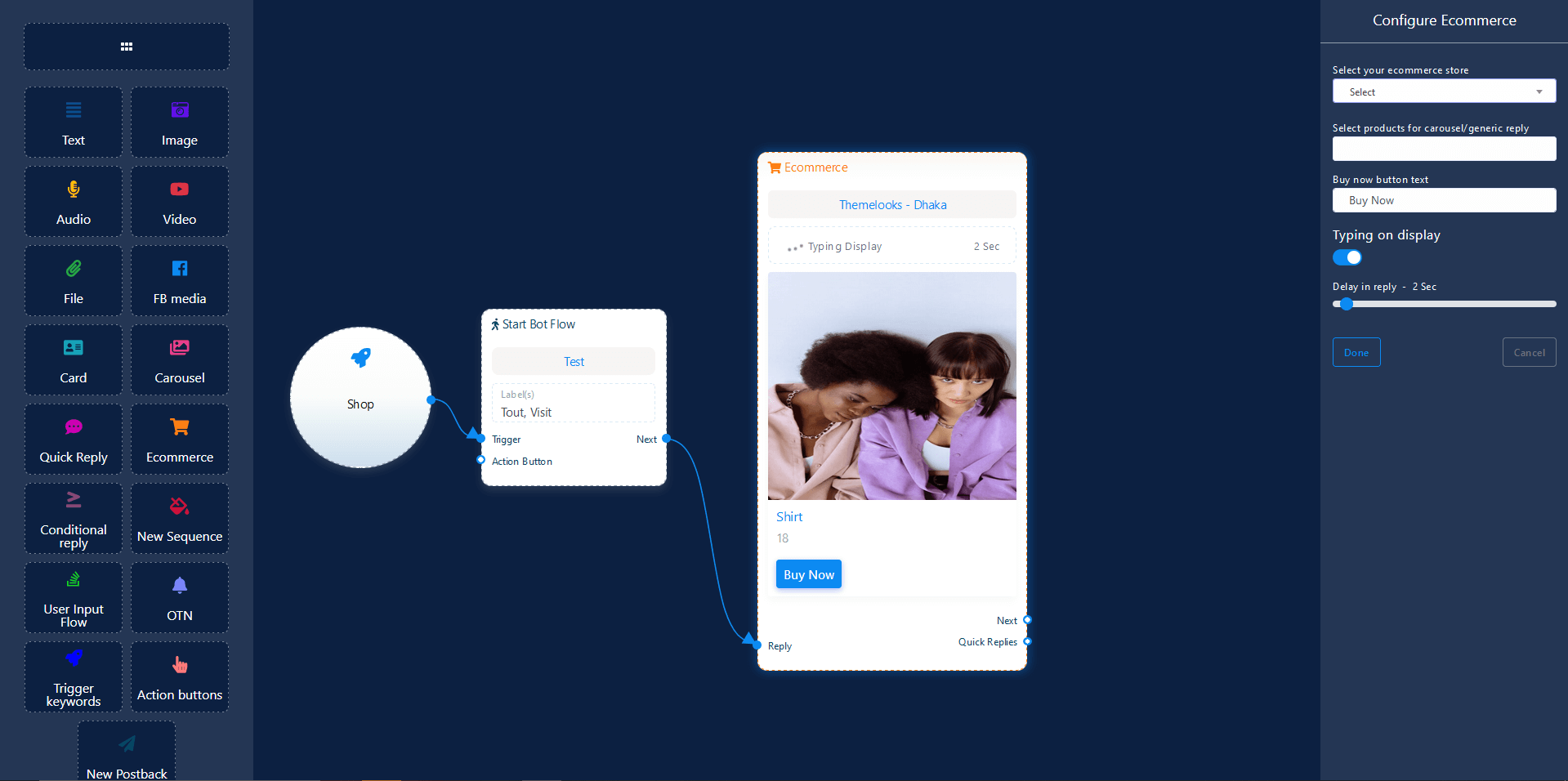 After you have selected a store, you have to select products for carousel/ generic reply. Just as click on the field, a drop-down menu of different products will appear. Now select products from the drop-down menu. Of course, you can select multiple products. Then you have to write text for the buy now button. Also, you can enable typing on display and select delay time in seconds. Now click on the done button.