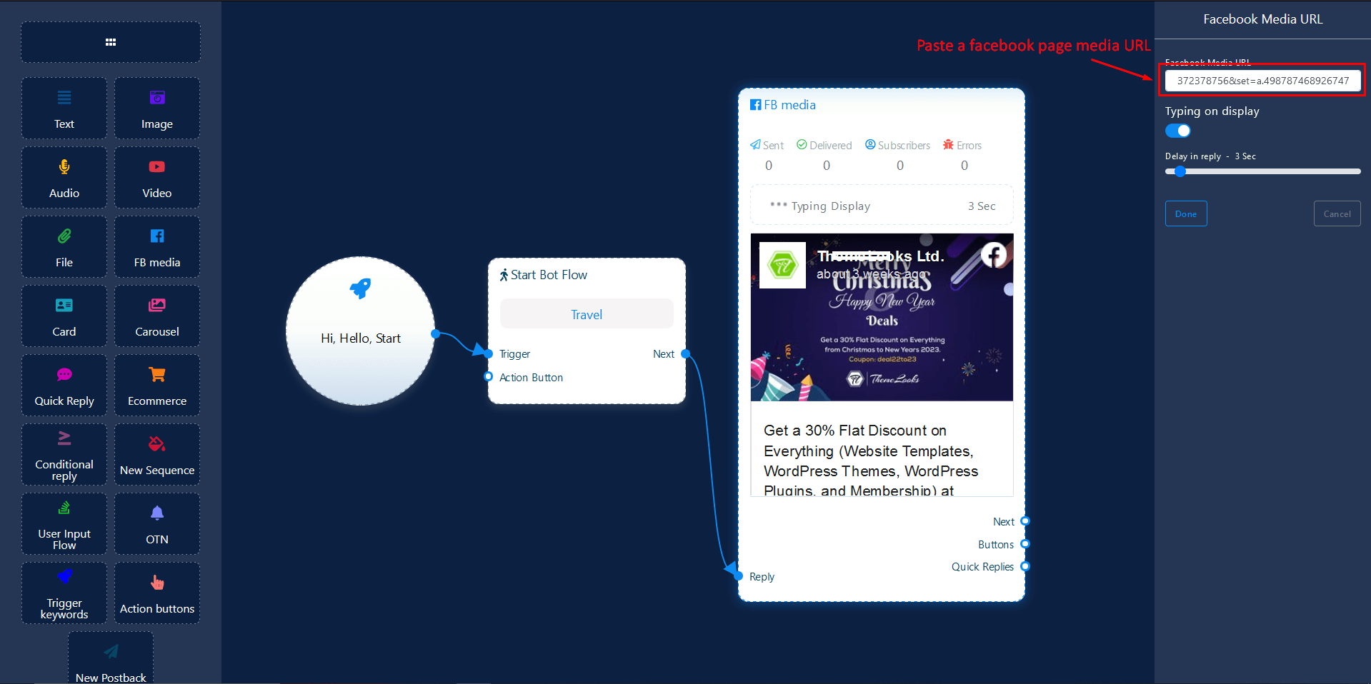 You can enable typing on display and select time in seconds for the delay in reply. Now click on the done button and the Facebook page media URL will appear on the component.