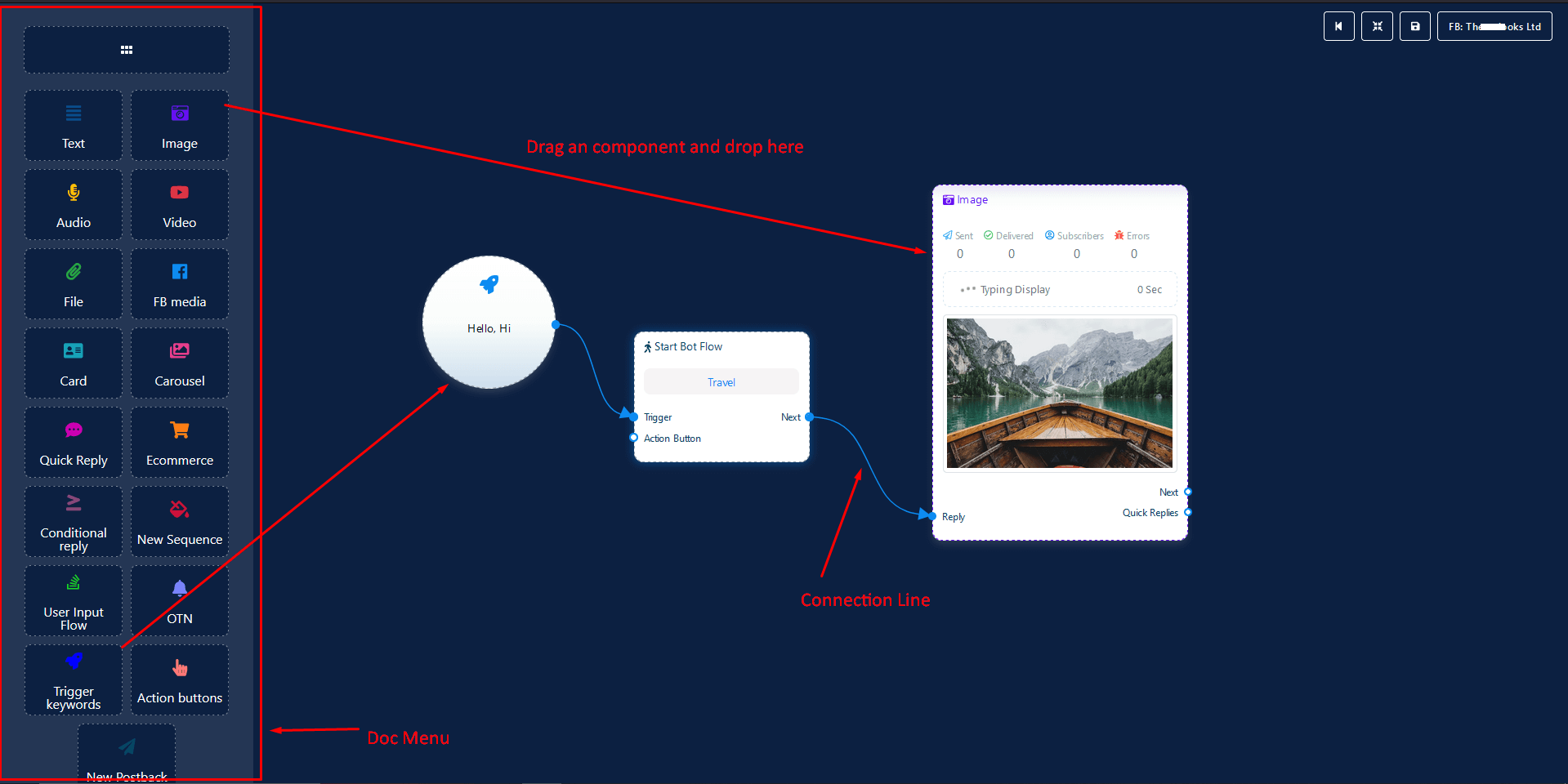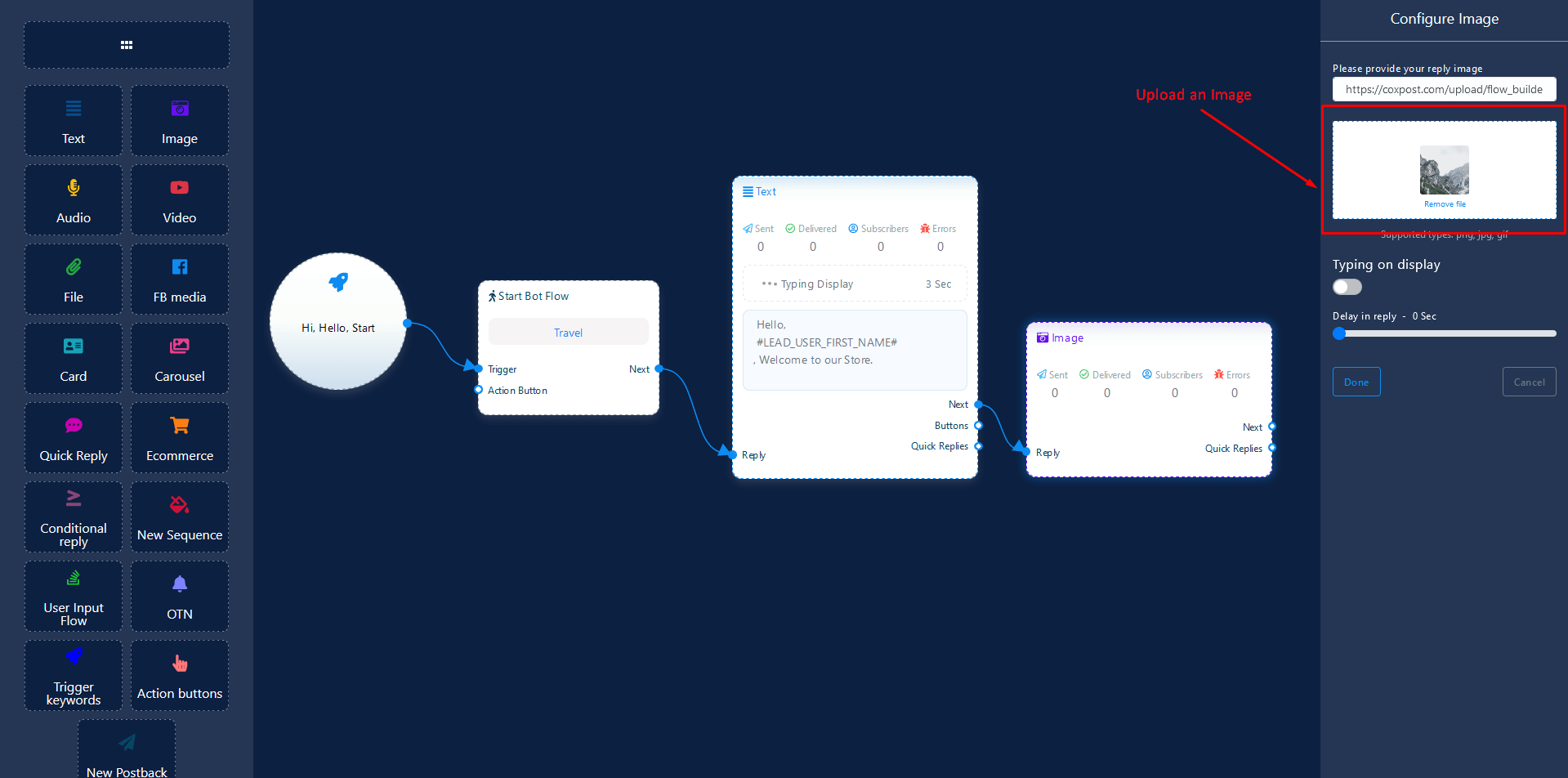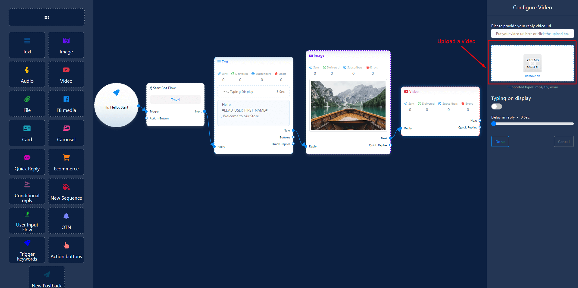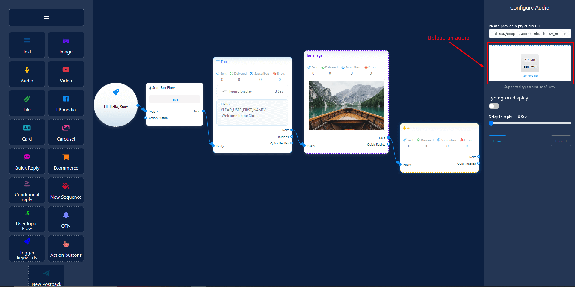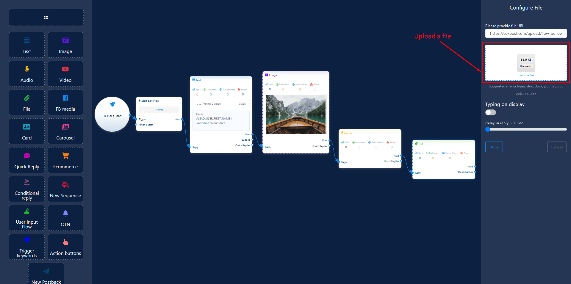 Likewise, you can add Image, Audio, Video, and File components. For these components, you have to upload an image, audio, video, and file respectively. Then you have to connect the components with other components.