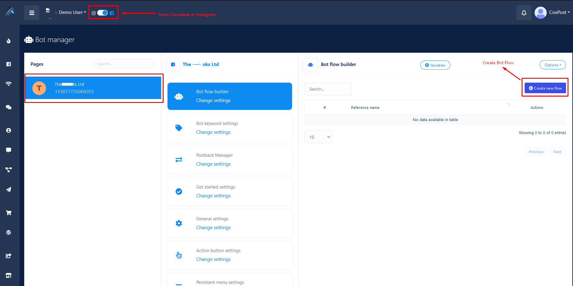 In this blog, I will show you how to create Facebook Messenger bot and Instagram DM bot with coxpost Flow Builder. Please follow the instructional blog step by step to create an interactive Facebook Messenger bot or Instagram DM bot.