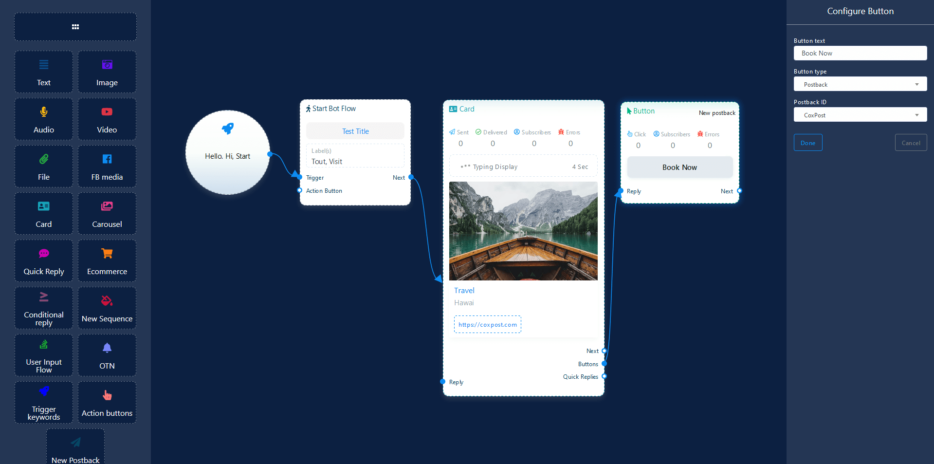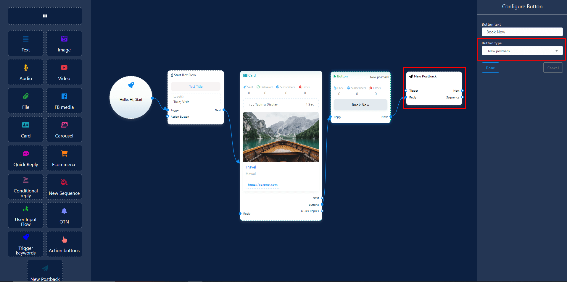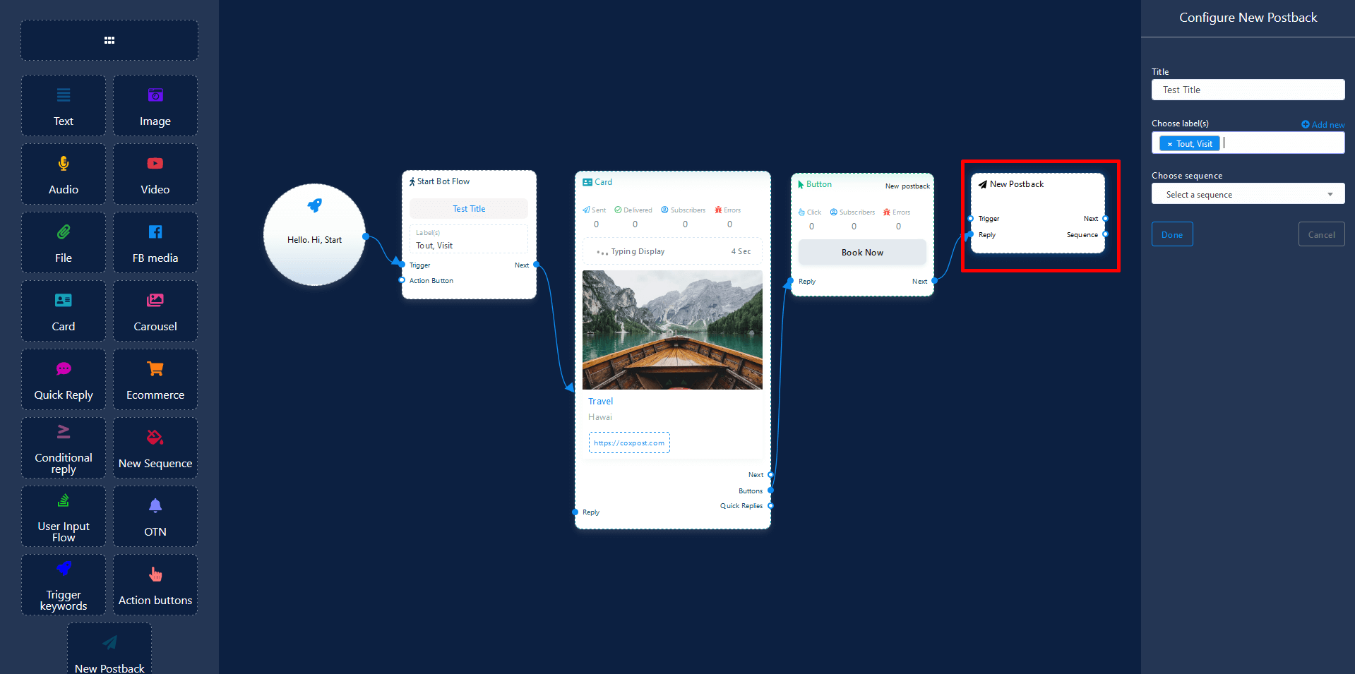 Now double click on the new postback element and the right sidebar called configure new postback will appear. Give a title for the New postback in the title field. And select label from the Choose label field. Now click on the done button.After that, you have to add another component with the next output of the New postback component.
